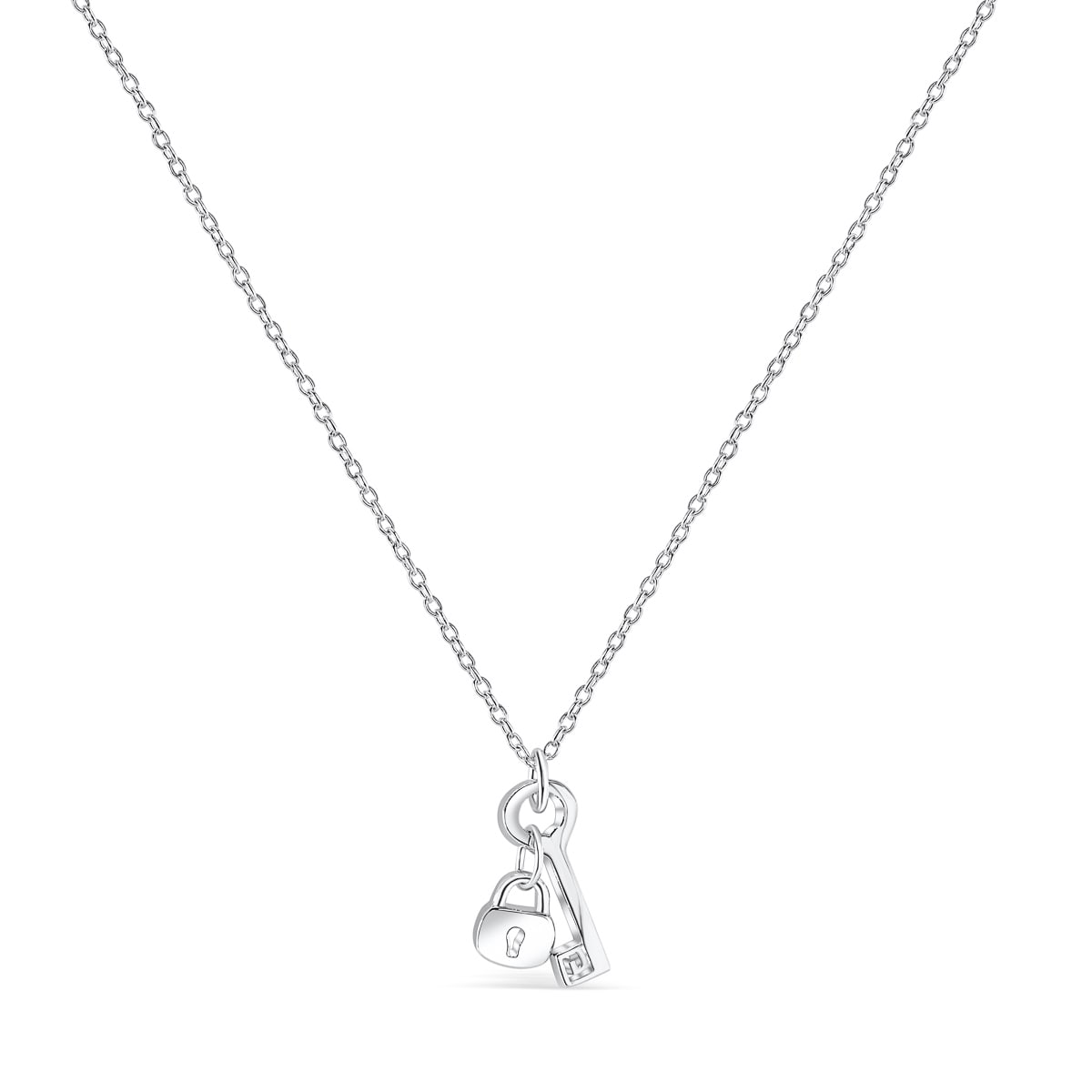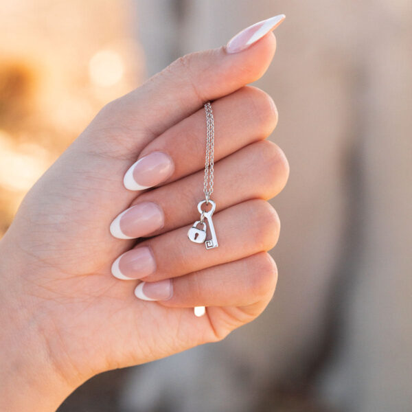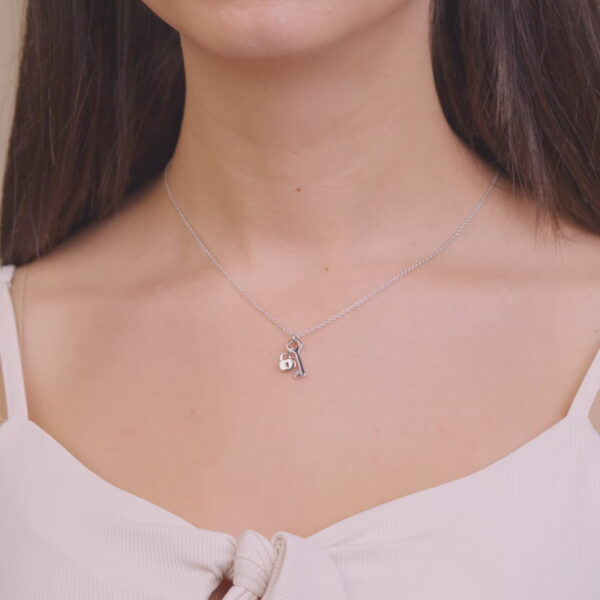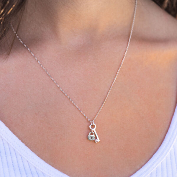 You can take my heart and throw away the key – or, wear it around your neck for safe keeping! This necklace features a solid lock and key pendant on a dainty chain necklace. Made with the highest quality 925 sterling silver and plated in rhodium, this piece will keep its shine for years to come!