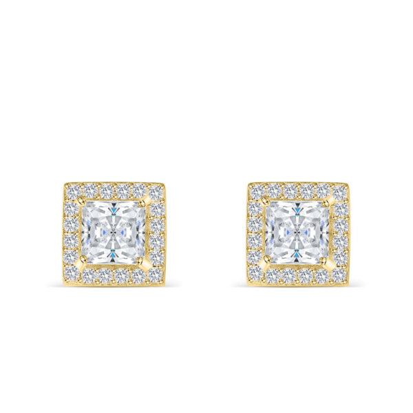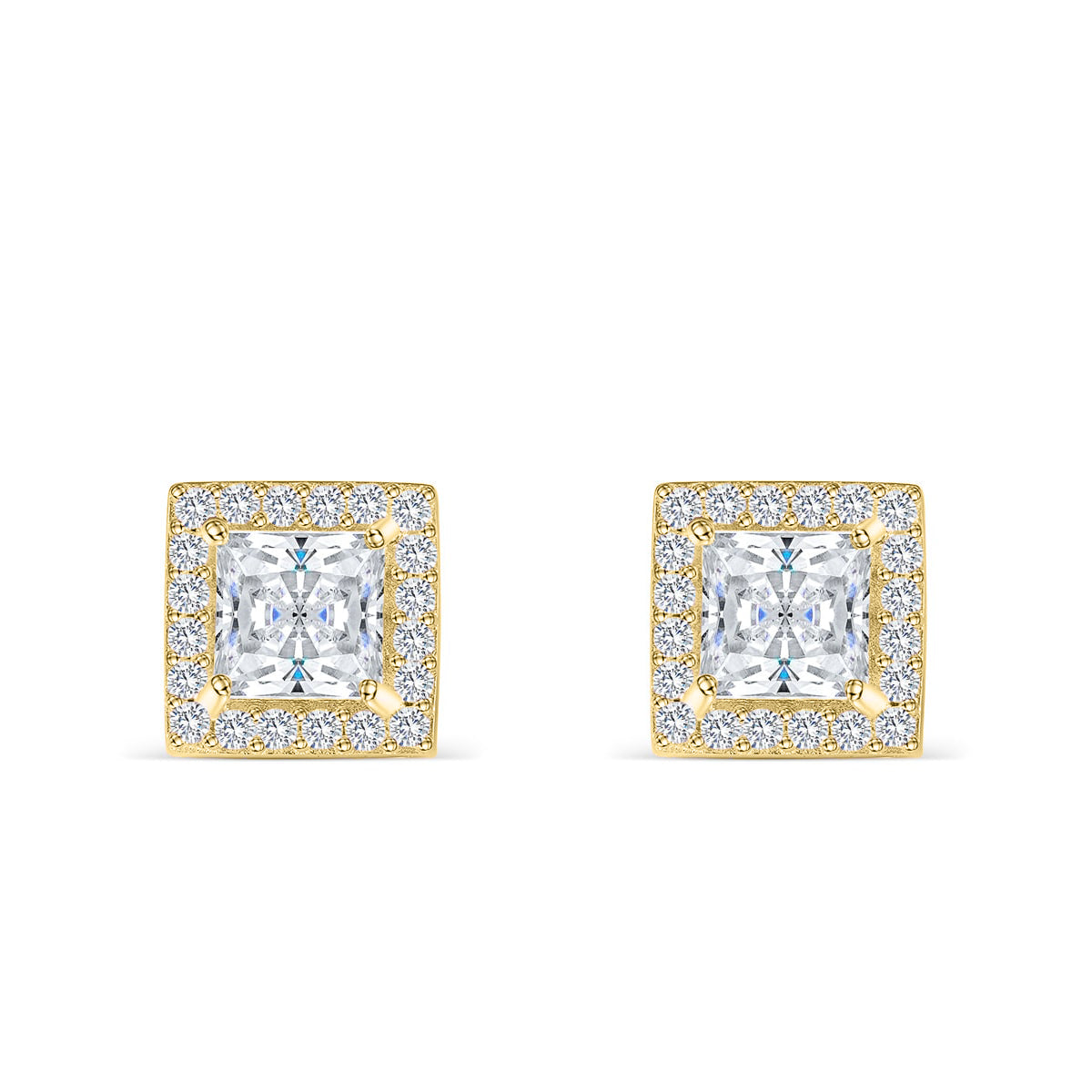The set that’s bound to turn heads! This earrings features a gorgeous 1 carat princess cut center stone, surrounded by a delicately placed halo. Made with the highest quality 925 sterling silver, stunning conflict free simulated diamonds, and plated in 18k Gold, this pair of earrings will keep its radiance for years to come! These simulated diamond earrings complement all kinds of jewelry!