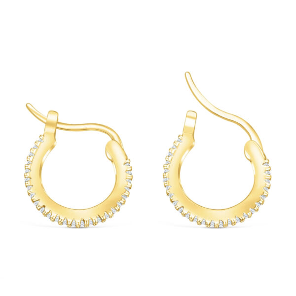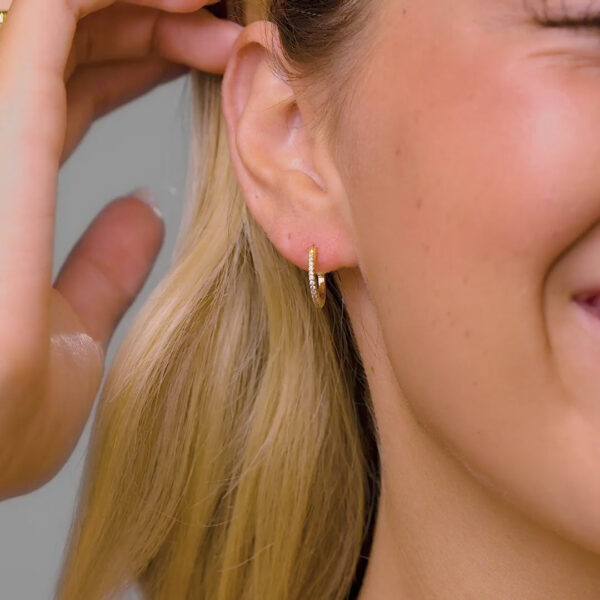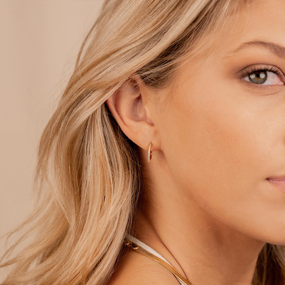 These earrings are lightweight and durable – perfect for your everyday life. Plated in 18k gold and lined with high quality simulated diamonds, pair them with any outfit for a dainty gold flair. Dress them up or dress them down, you will not want to take these earrings off.