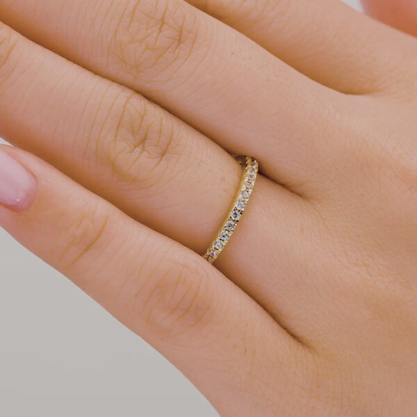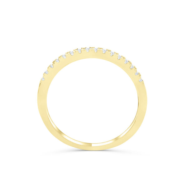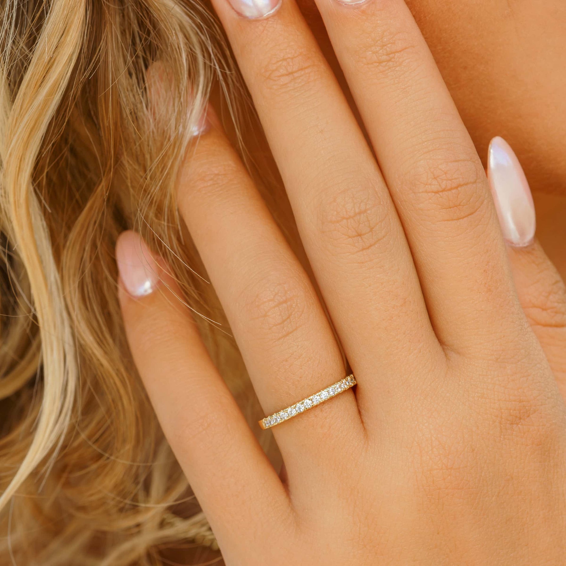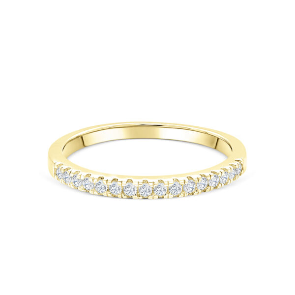 Step aside everyone, This ring is now available in our timeless yellow gold! This half-eternity band is a style that is here to stay despite the ever-changing trends and seasons. At 2mm wide, it’s the perfect size for a ring that’s not too thick, not too thin. Along the band are delicately placed stones that travel halfway around, making it extremely comfortable to wear.