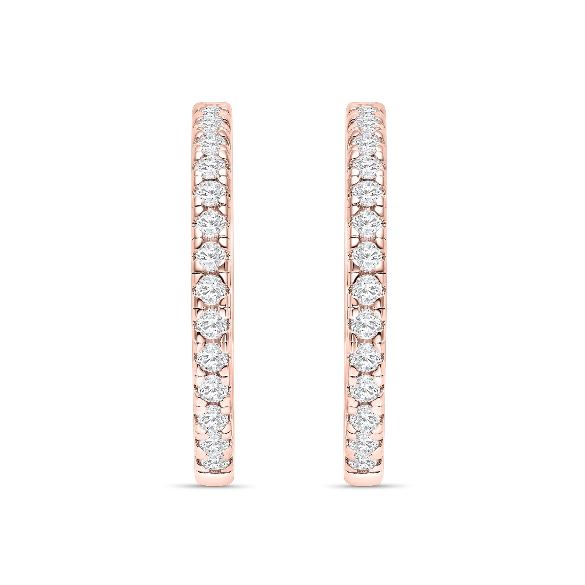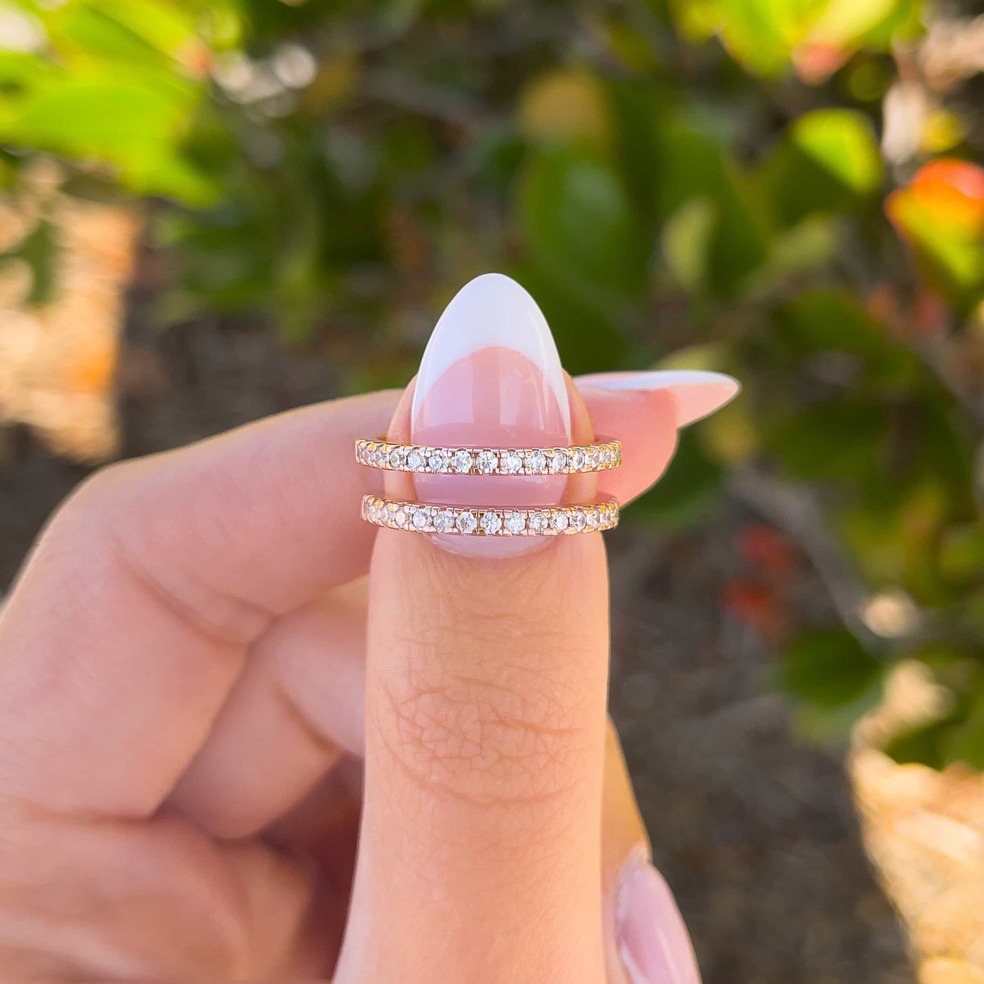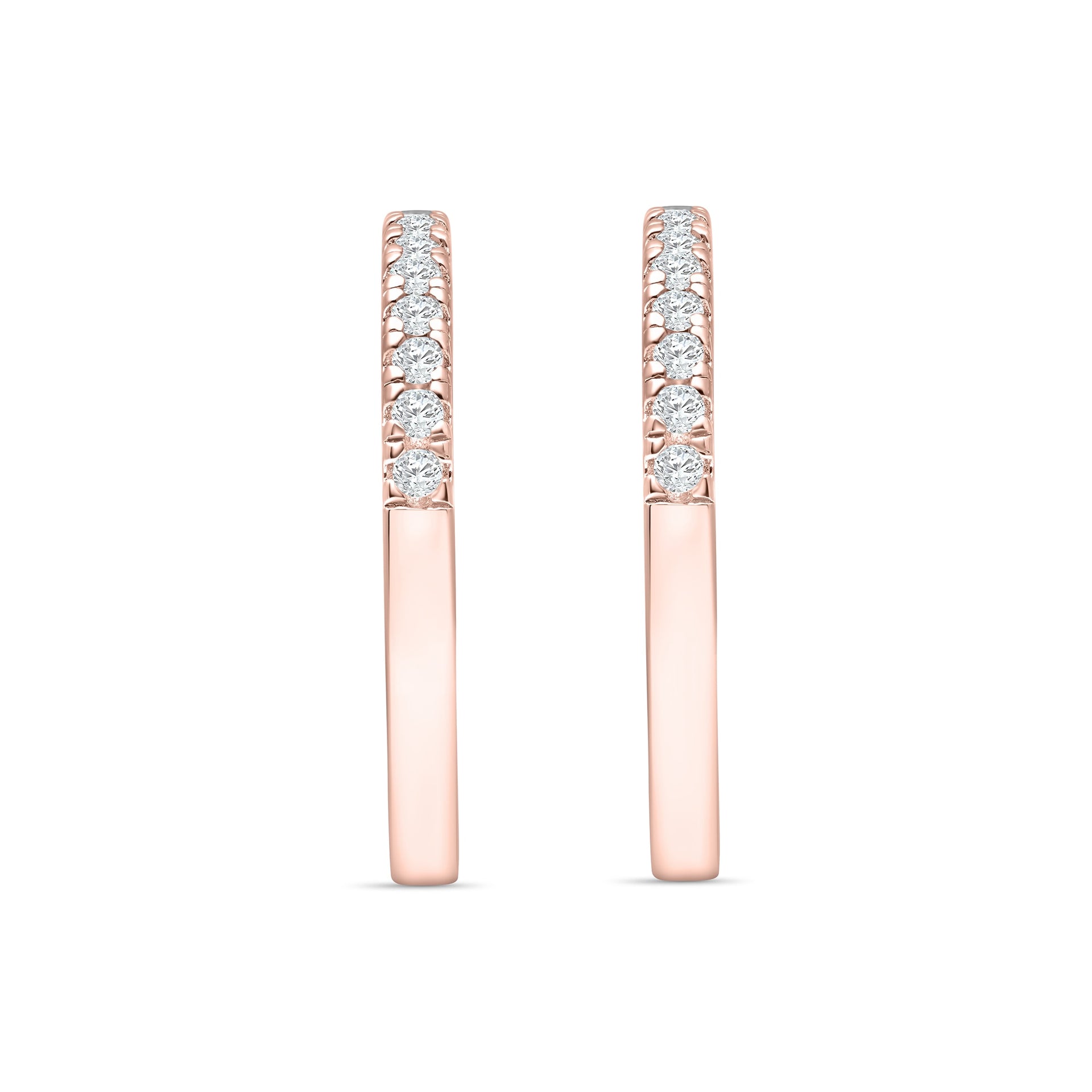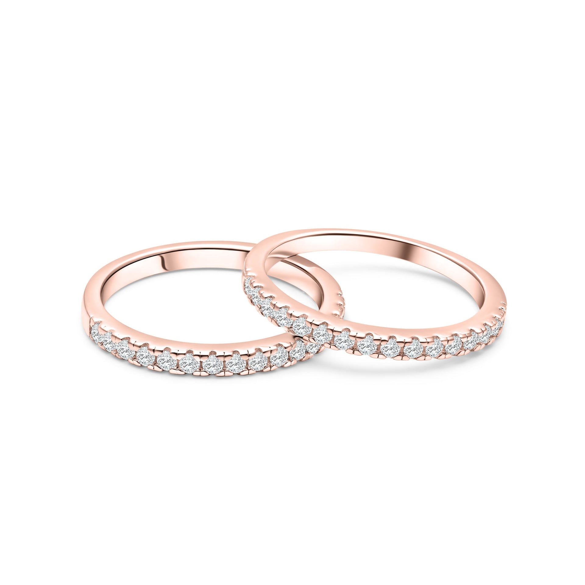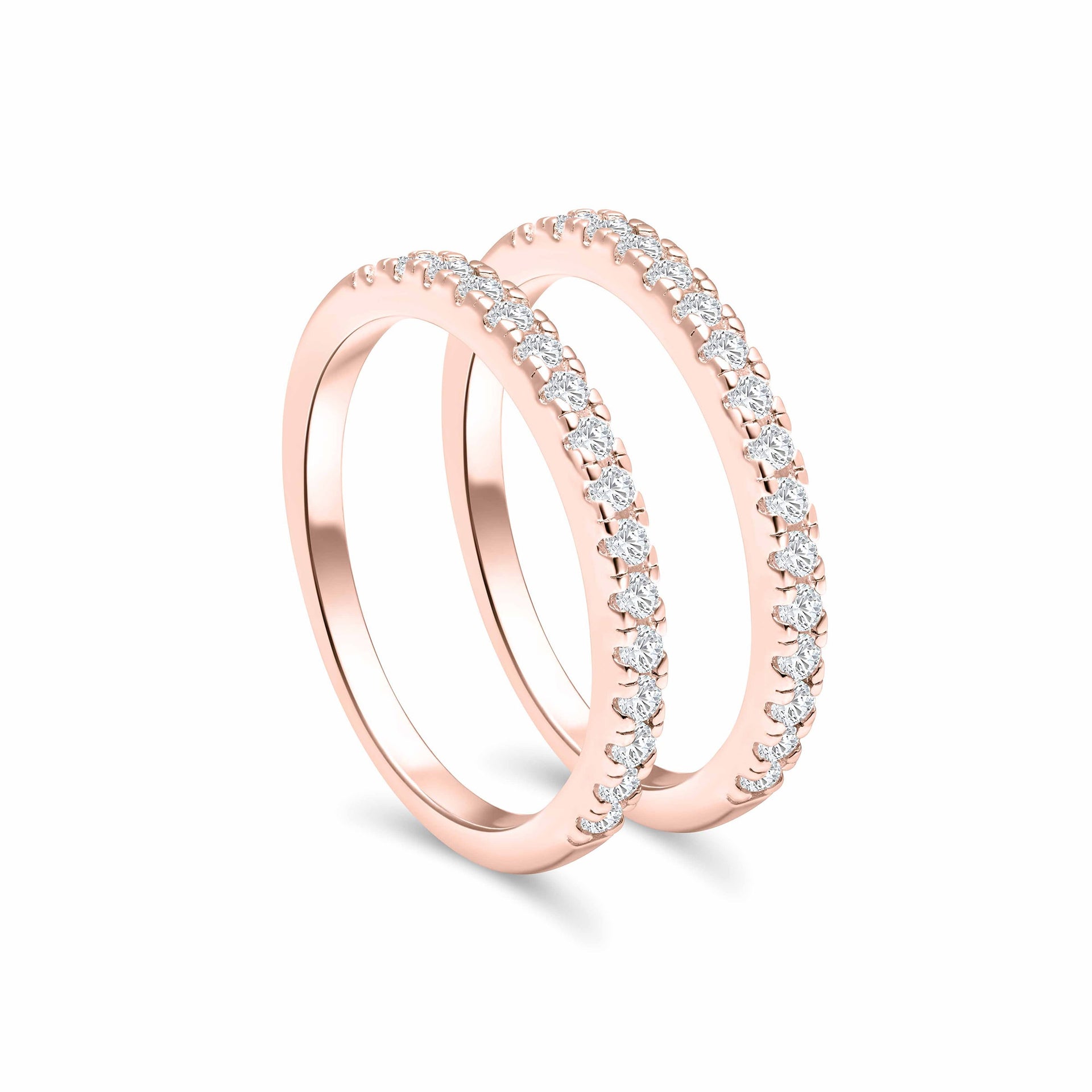 Feel all the romantic vibes when stacking your engagement ring with this ring – rose gold. This ring is a true fan favorite with its 2mm width and half eternity band detailing. With two in a set, you can mix, match, and stack to your heart’s content! This wedding band stack is ideal to pair with any style of engagement ring! Stack it with other rings to create a look that is effortlessly chic or wear it with other rings for something truly classic. This stacking set is also available in silver and gold.