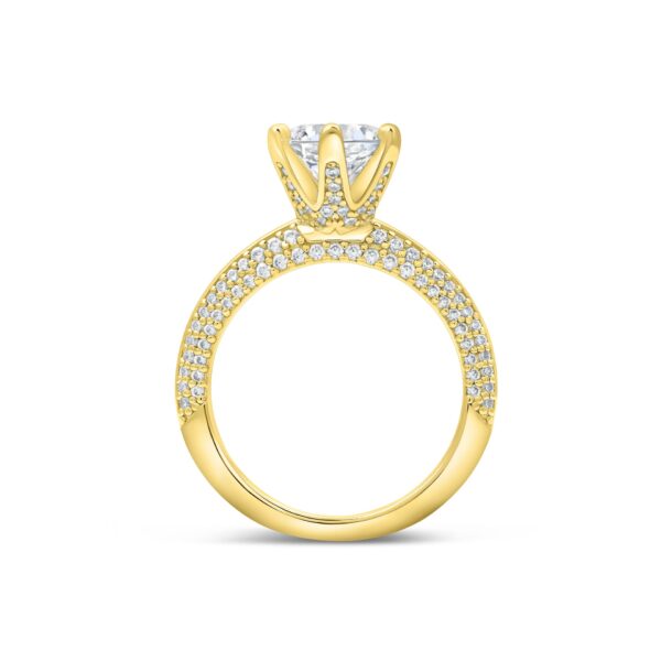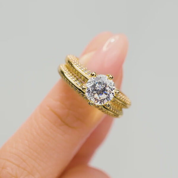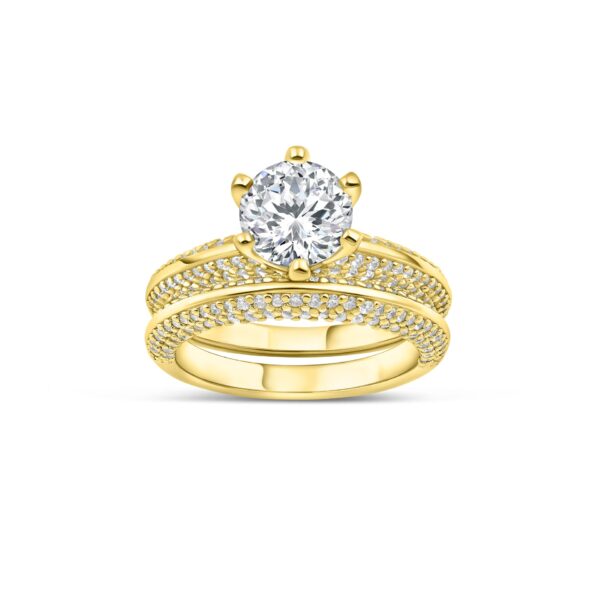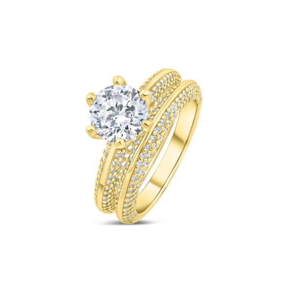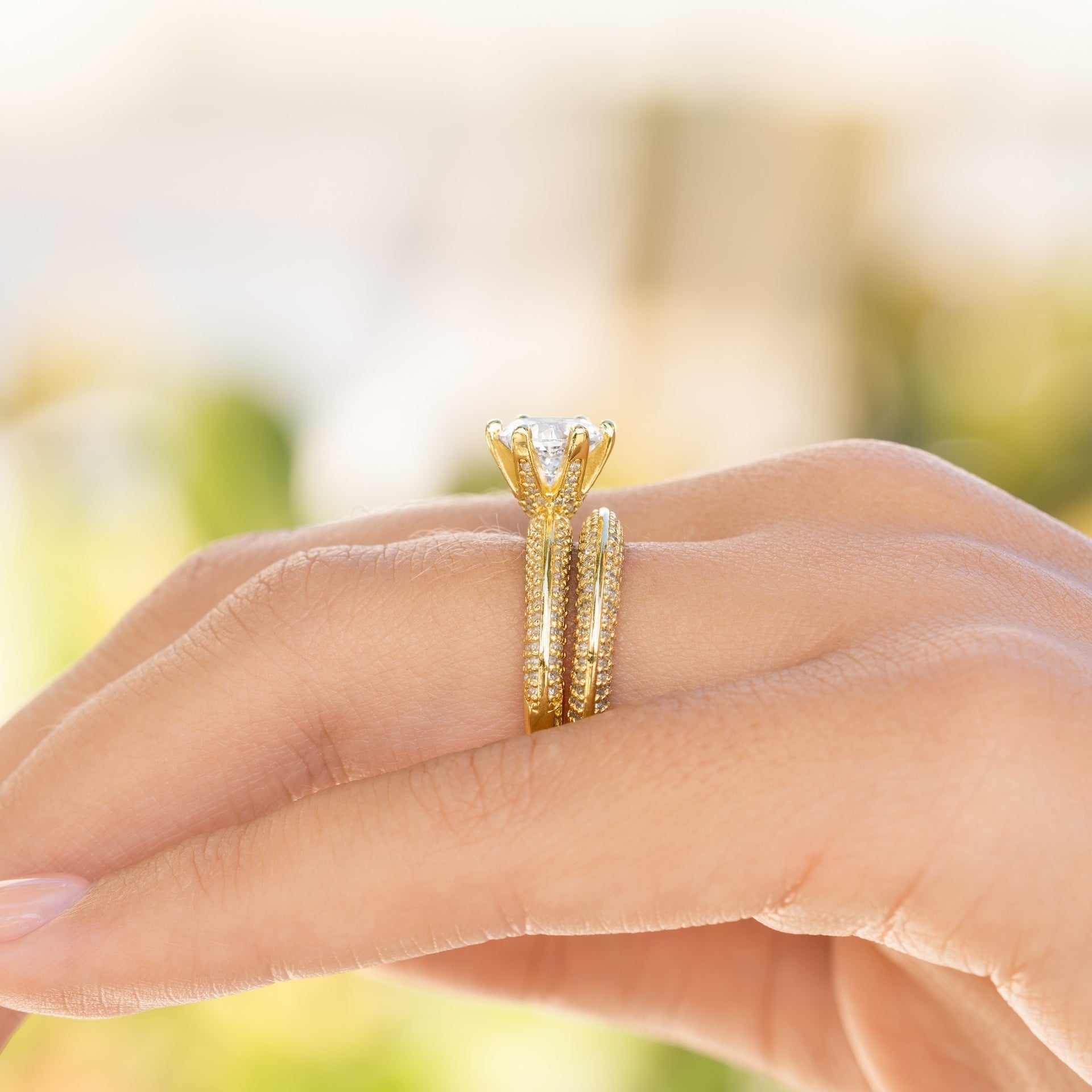 Prepare to fall in love over and over again with this breathtaking 2 carat round cut ring! Held by six sparkly prongs, the center stone sits on top of a thick, rounded half eternity band – but the sparkle doesn’t end there! This dazzling ring comes with an additional half eternity band making it a match made in heaven. This is the ring you want to say “yes” to!
