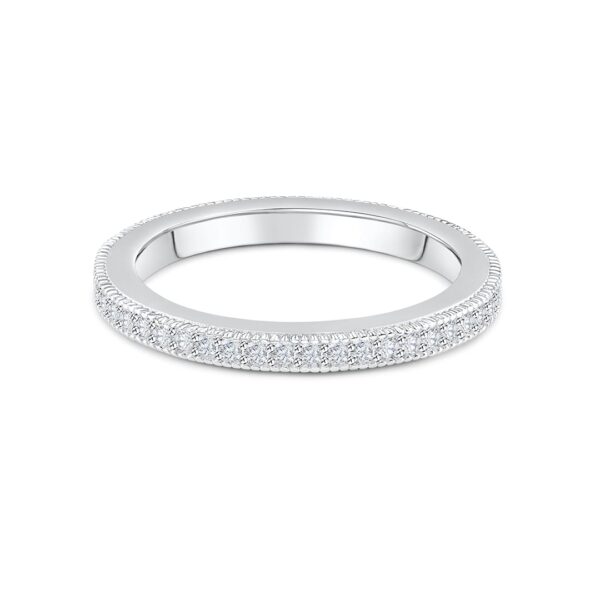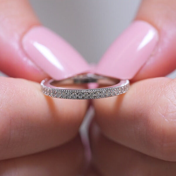 Featuring glimmering stones set delicately within a channel setting, this band is a definite classic. At 2mm wide, it is the same size as our popular rings. This stackable band is made of 925 sterling silver and plated in rhodium, perfect to be used as a wedding band, engagement ring, or to compliment any other ring.