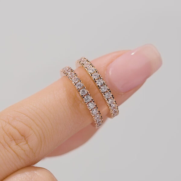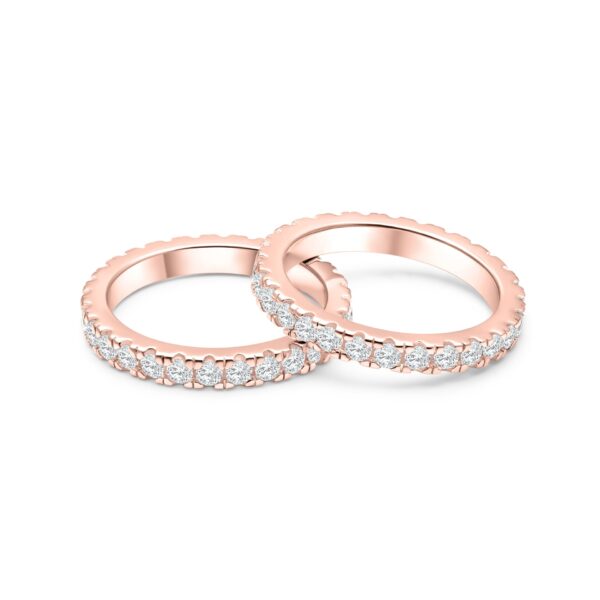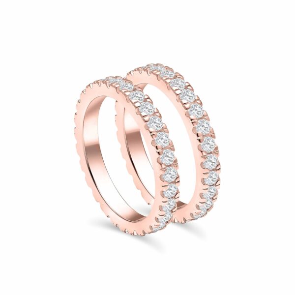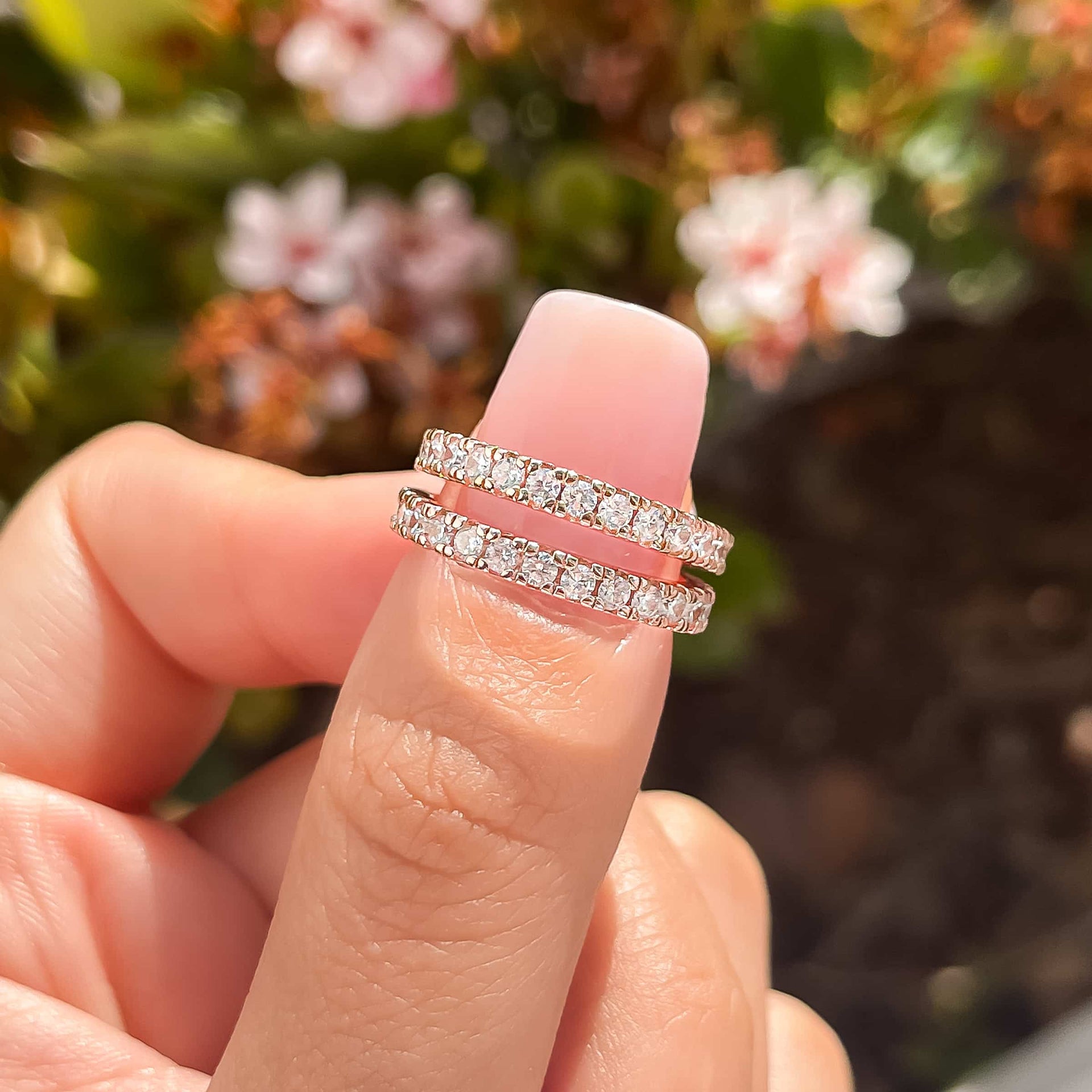 This ring has always brought the sparkle on its own, and this set of two only gets better. At a thicker width of 2.6mm and a full eternity detail along the bands, this set gives brilliance like no other. Double your wedding ring stack shine by pairing this wedding band set with any style of engagement ring, or try pairing it with our favorite ring. Big and bold is the name of the game! This stacking set is also available in silver and gold.