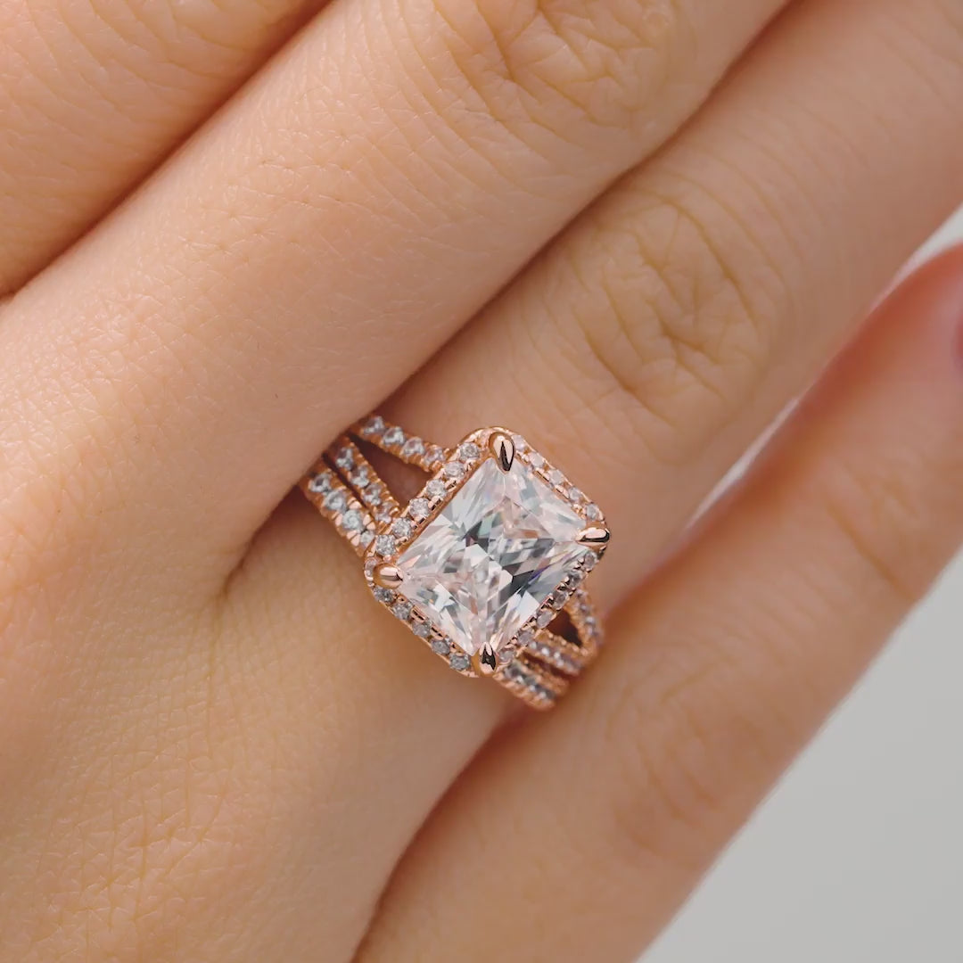 A wedding set created with love on the brain. This ring embodies true romance with its 3.5 carat radiant cut stone and sparkling halo. It has a split, half eternity band trickling down the sides, and a separate half eternity band that fits absolutely perfectly with it. Plated in a shimmering rose gold, this wedding set will have you in a trance with its beauty!