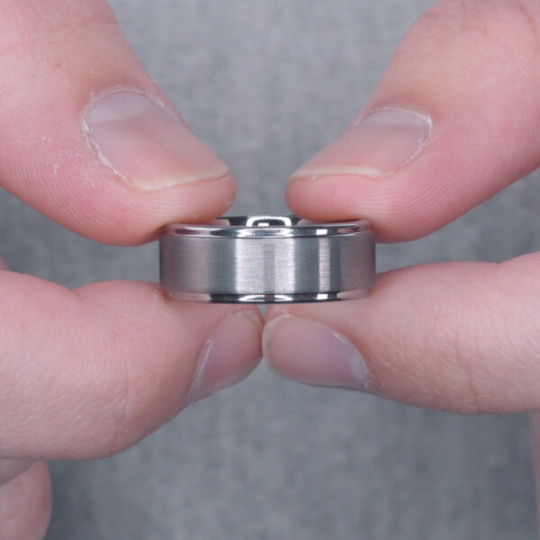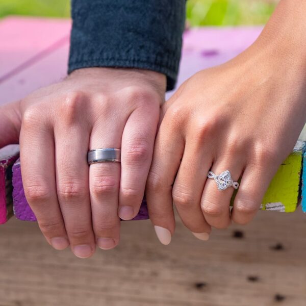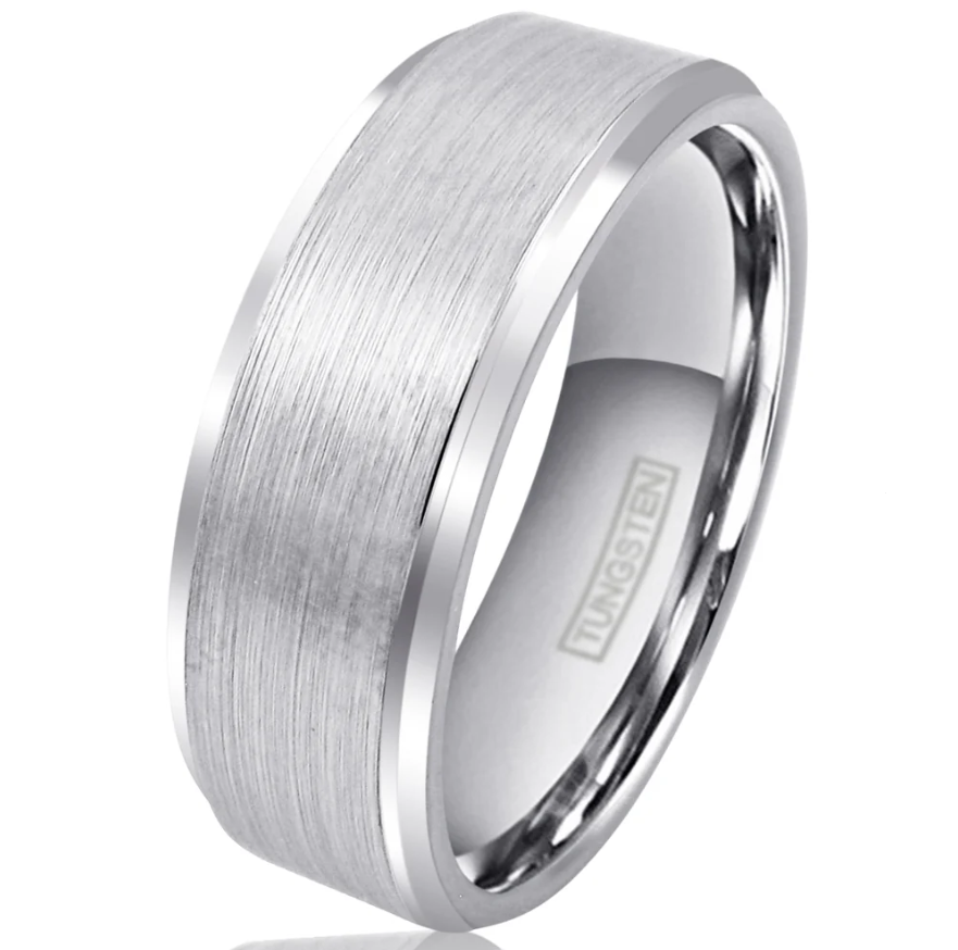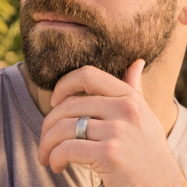 Silver is a classic tungsten carbide silver wedding band, ideal for the contemporary man. This silver ring is robust, stylish, and durable, perfect for any occasion. Whether you’re married, engaged, or just need a ring that can withstand the elements, this men’s tungsten carbide wedding band adds a touch of class to your collection. Its sleek design and durability make it a superior choice for a wedding band. Also available in black and rose gold finishes.