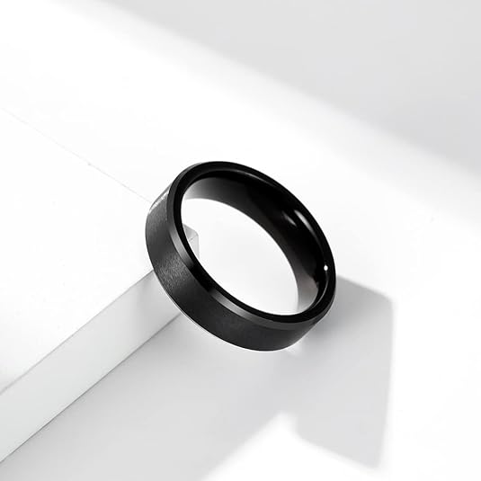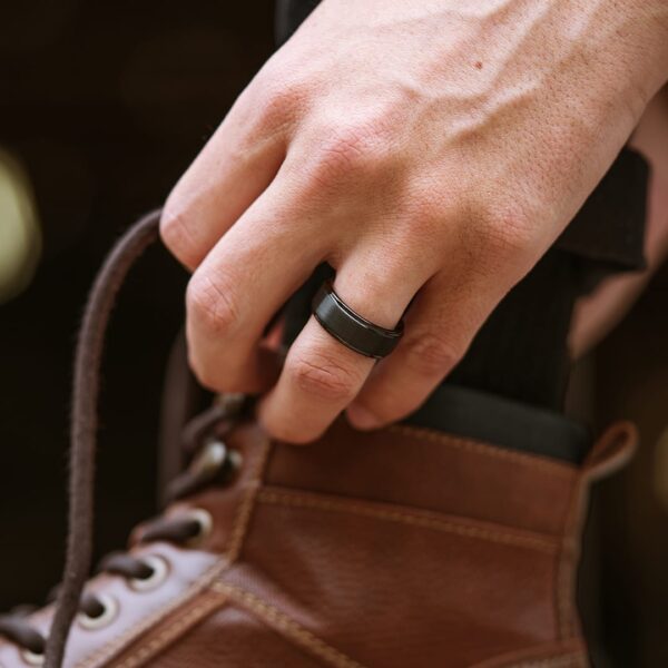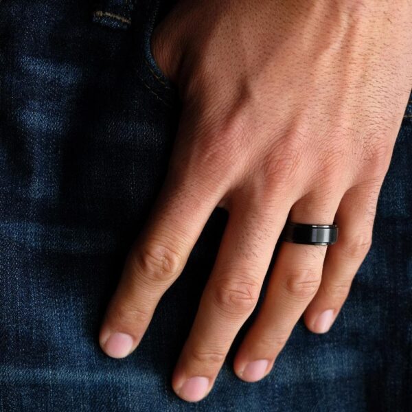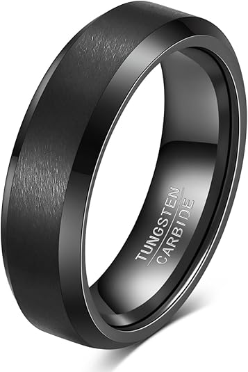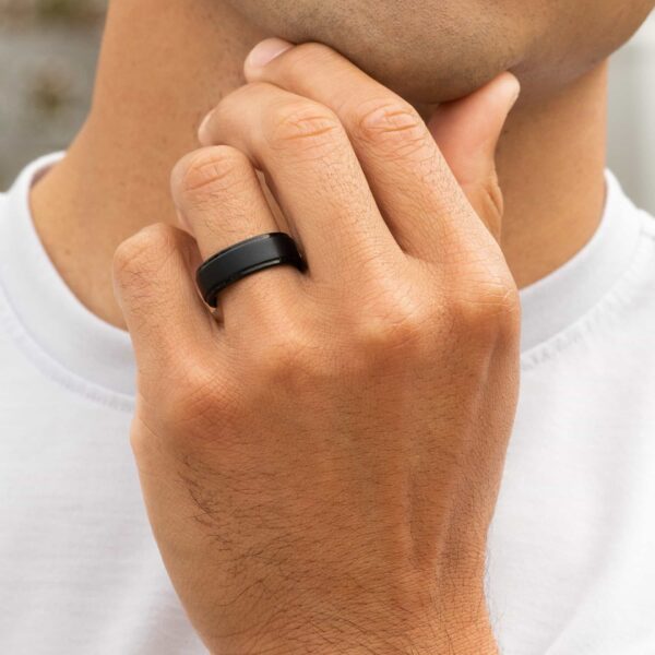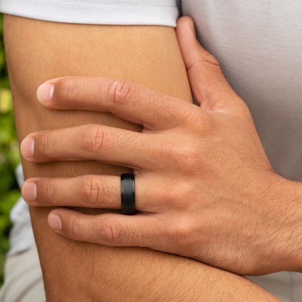 This ring in black is a timeless tungsten carbide wedding band, perfect for the modern man. This matte black ring is rock-solid, sleek, and durable, embodying strength and sophistication. Whether you’re married or not, elevate your style with this exceptional piece. Ideal for those seeking a high-quality and stylish men’s tungsten carbide wedding band. Also available in rose gold and silver finishes.