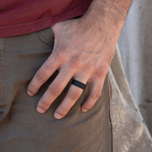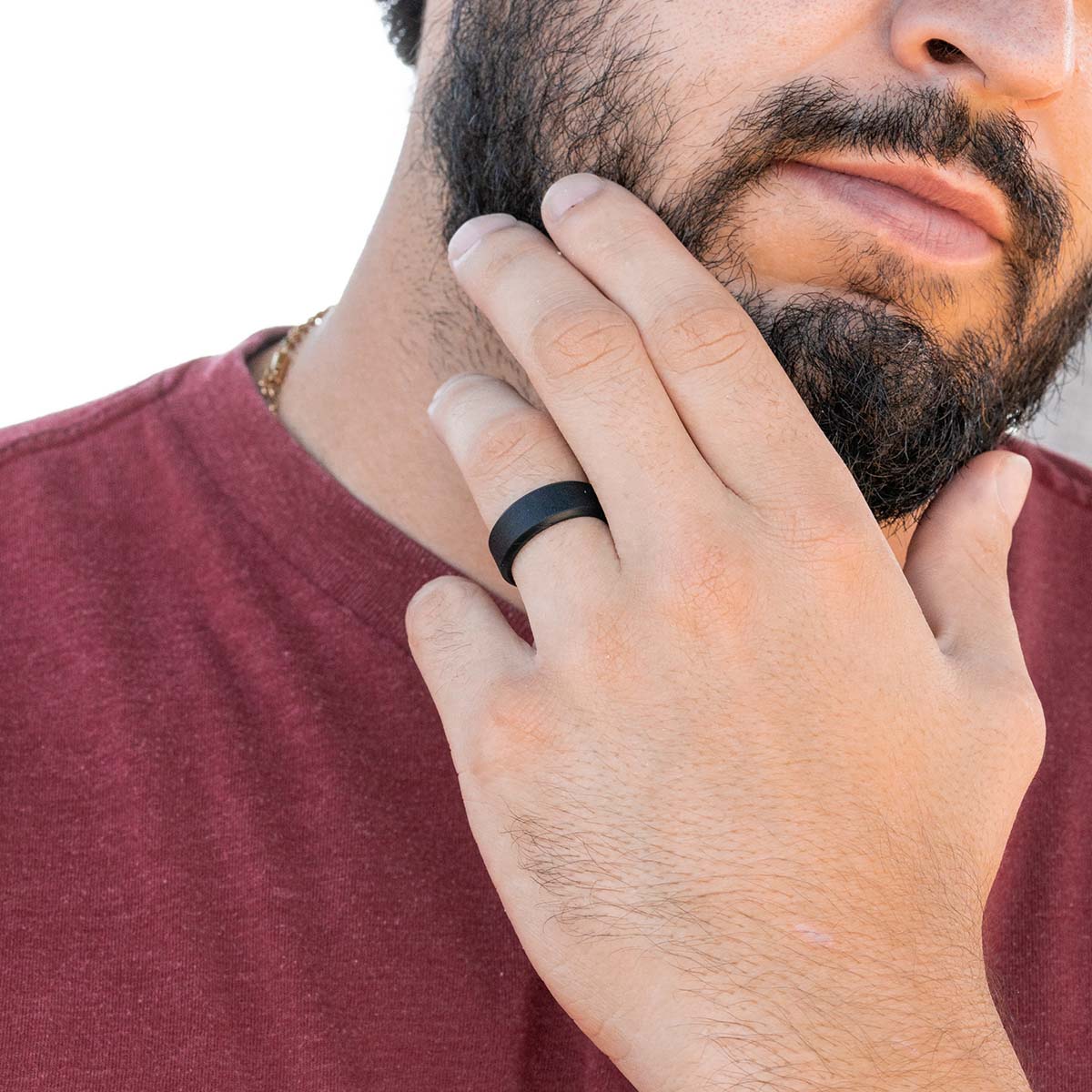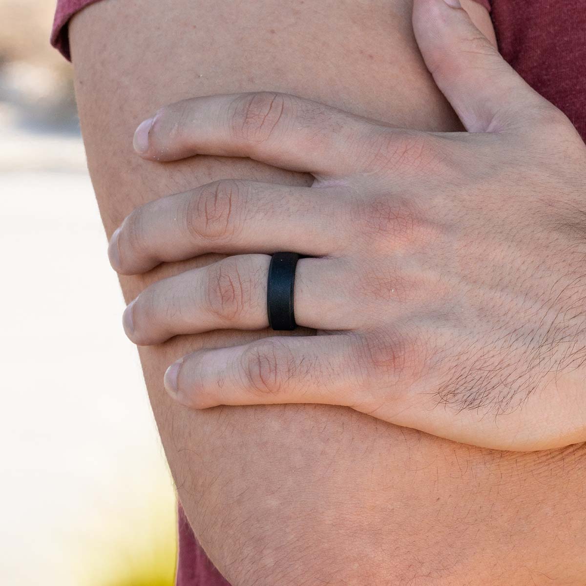 Looking for a silicone ring that doesn’t really look like a silicone ring? Measuring at 8mm wide with slick beveled edges, this ring is the best looking silicone ring we have! This silicone wedding ring is hypoallergenic, flexible and super comfortable! If you work with your hands, can’t wear a metal wedding ring at work, do physically demanding activities or like to switch things up, these rings are for you.