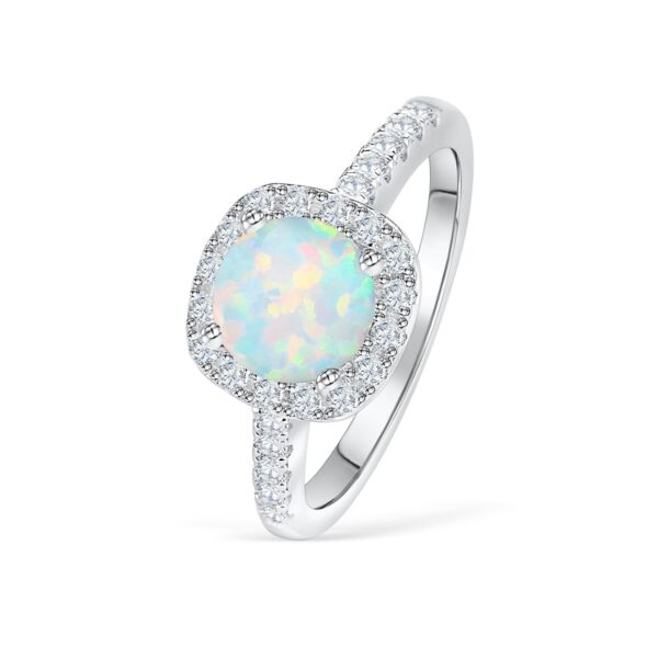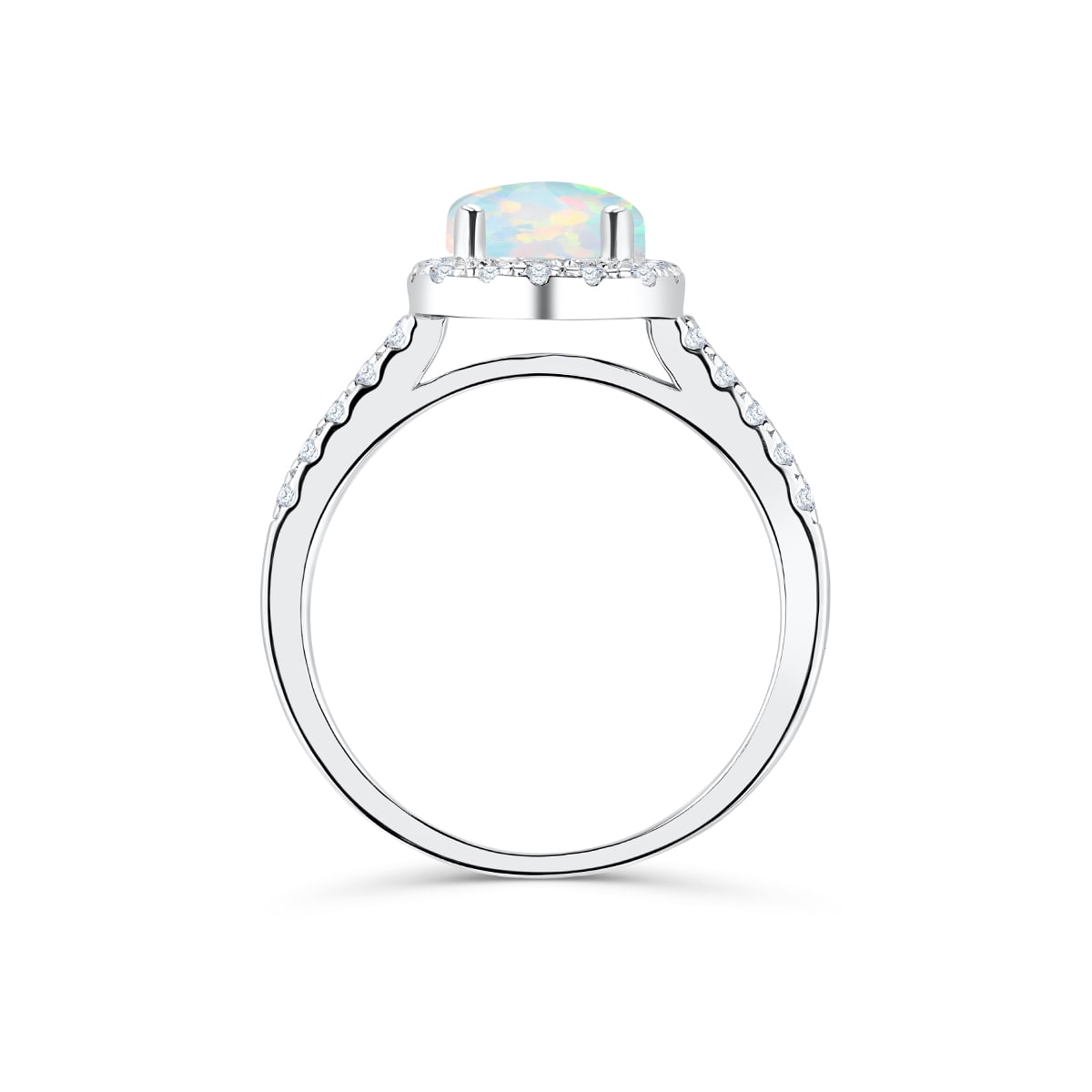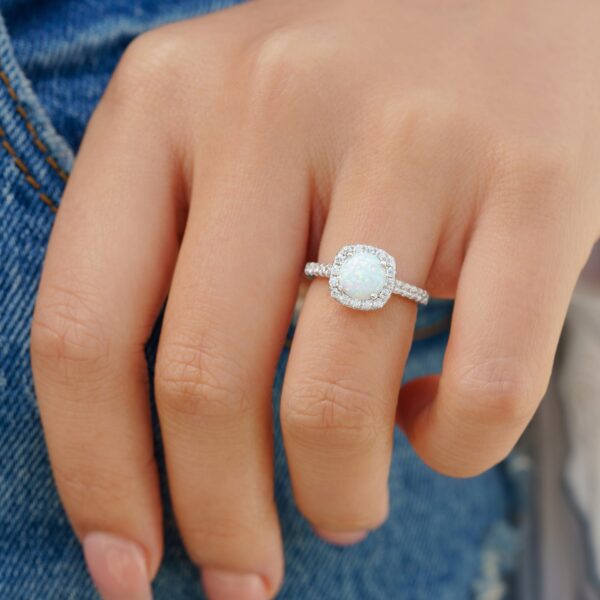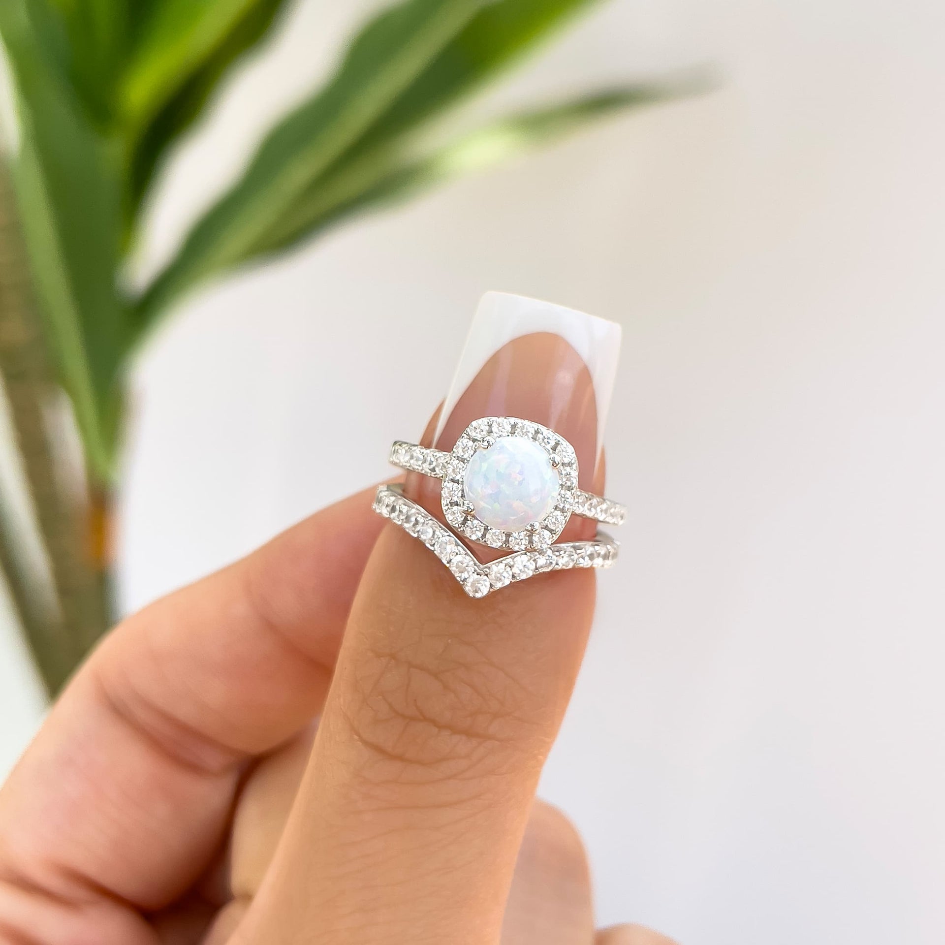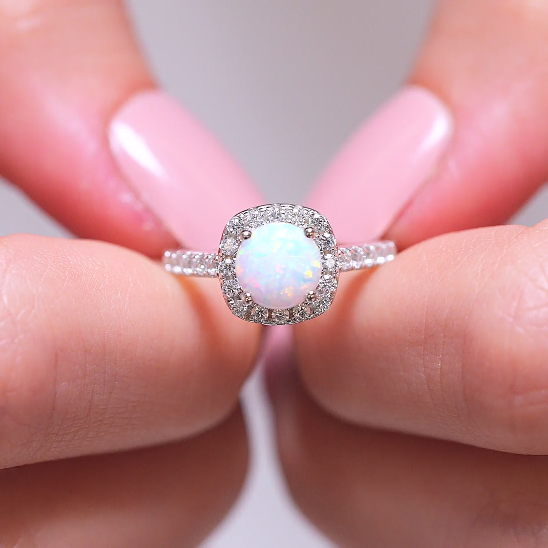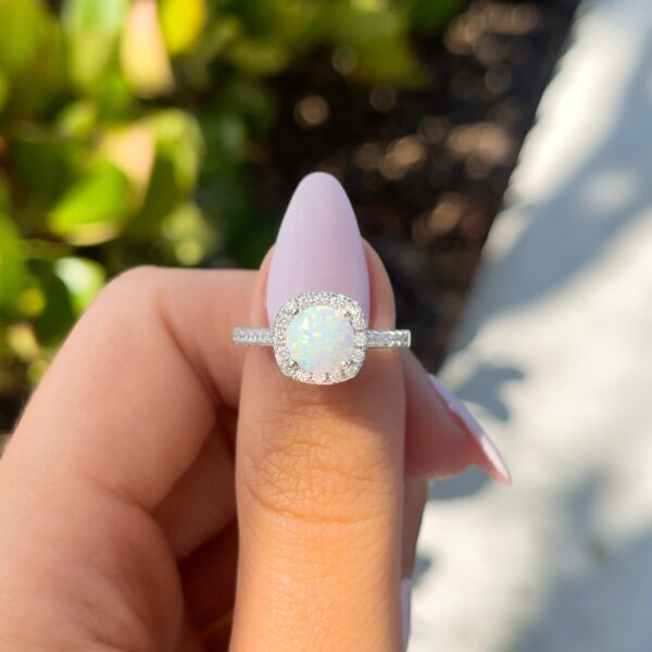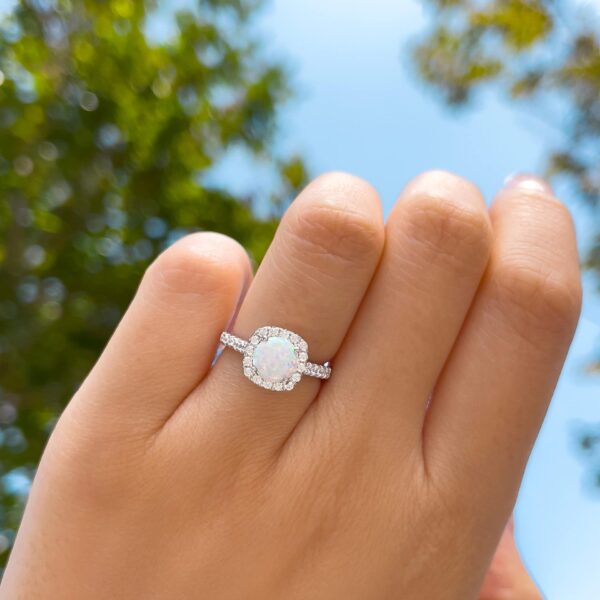 This beautifully designed ring features a gorgeous round cut simulated Opal center stone set in a beautiful intricate halo! This unique opal engagement ring changes colors as the light hits it from different angles! This ring is made of premium 925 sterling silver and is guaranteed for life!