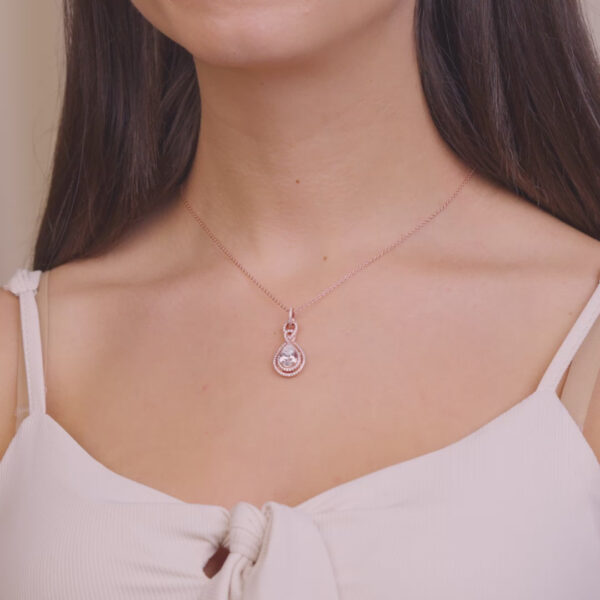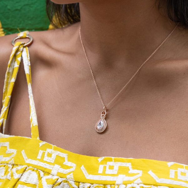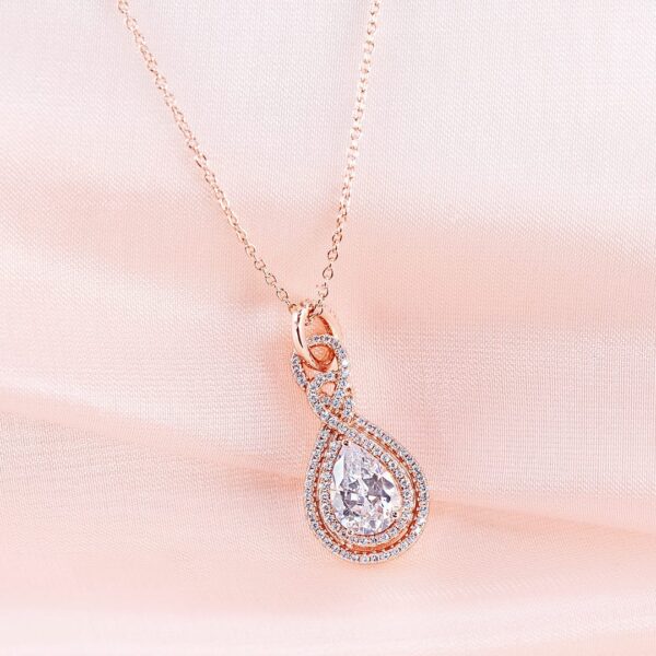 When you’re wearing this stunner, believe us: HEADS. WILL. TURN! This necklace features an opulent, layered figure 8 pendant encrusted in shimmering gems. Inside the figure 8 is a dazzling 2 carat teardrop shaped stone that multiplies the WOW factor by 10000x! Made with the highest quality 925 sterling silver, simulated diamonds, and plated in rose gold, this piece will keep its radiance for years to come!