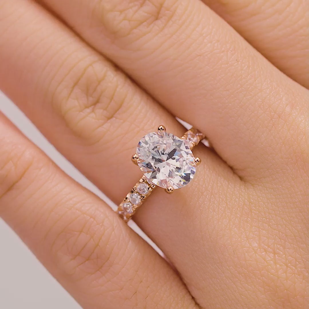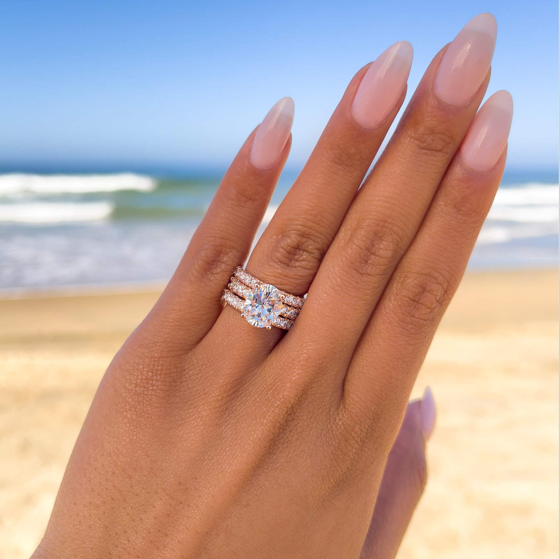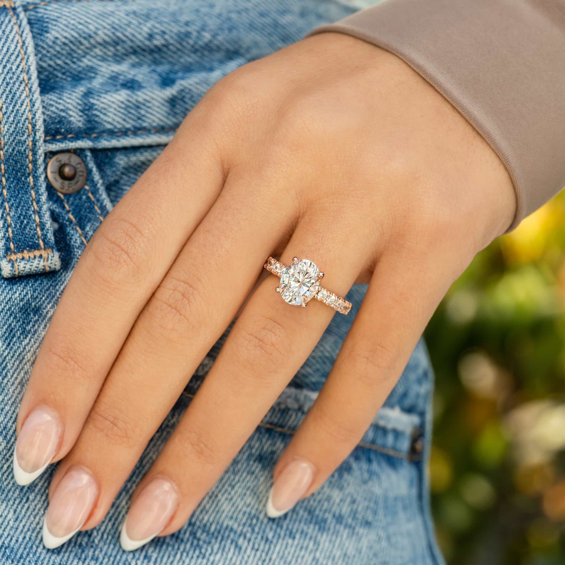 This is more than a ring, it’s your love story – beautiful, modern, & simply brilliant. This 3 carat oval cut engagement ring features a 2.7mm wide half eternity band that work together to create the most classic and luxurious design. With a warm blush of rose gold all over, this ring truly captures the very essence of romance. When wearing this ring, you’ll radiate pure elegance 24/7!