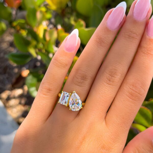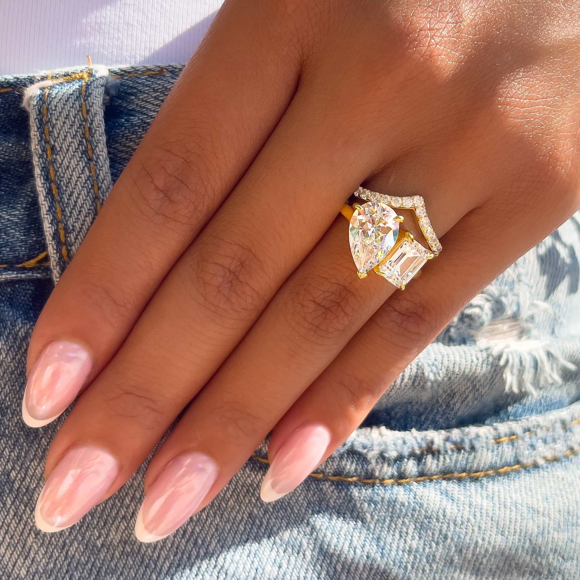 Designed with simplistic luxury in mind, This ring creates a look that is effortlessly breathtaking. The ring style “toi et moi”, directly translates from French to “you and me”, capturing the beauty of two perfect stones (or people) together forever. This timeless engagement ring features a two-stone setting, made up of a 1.75 carat emerald cut stone and a 4 carat pear cut stone that create a sparkle that enchants all. Completed by a polished gold band, This ring is a modern take on a classic style that’ll look perfect on you. Also available in silver.