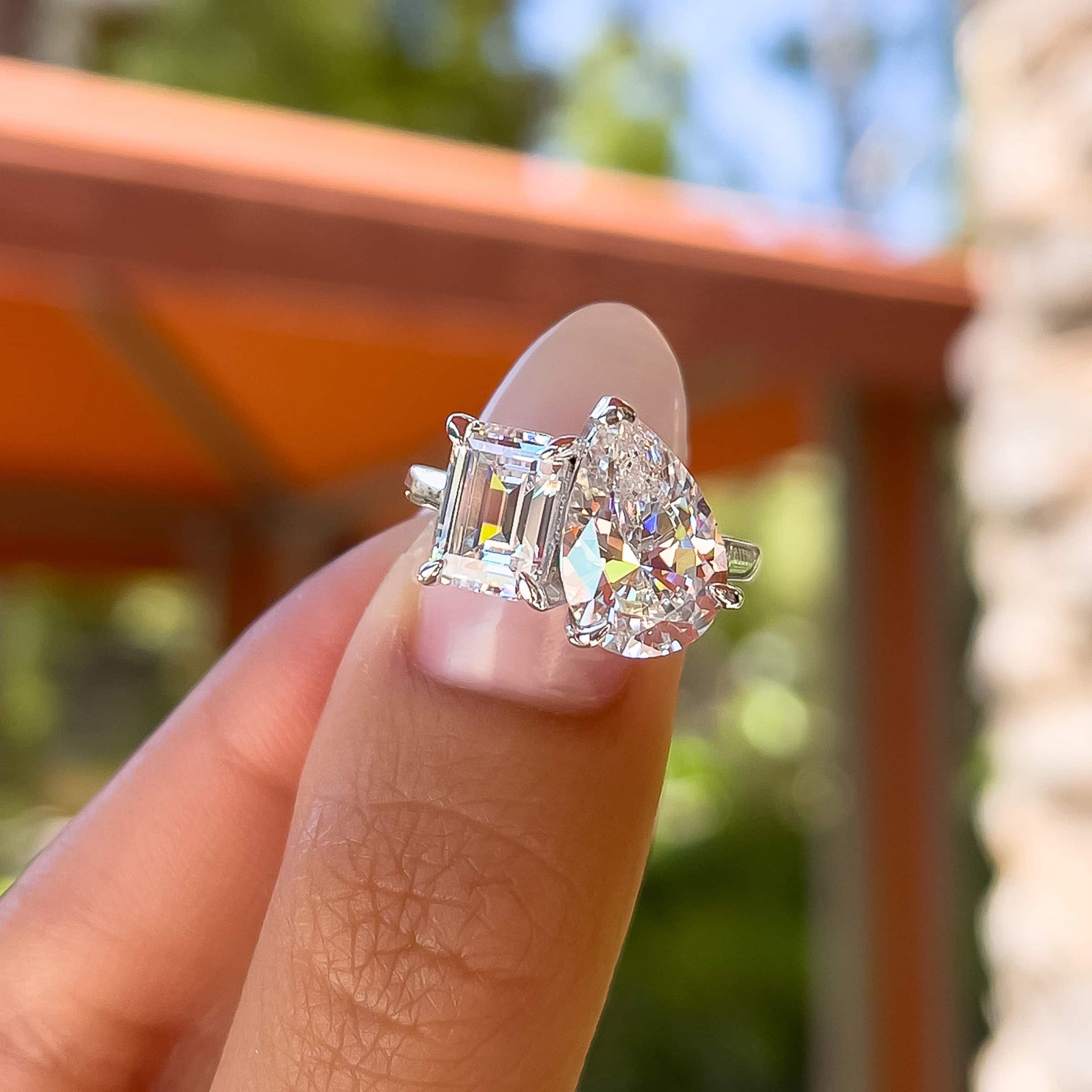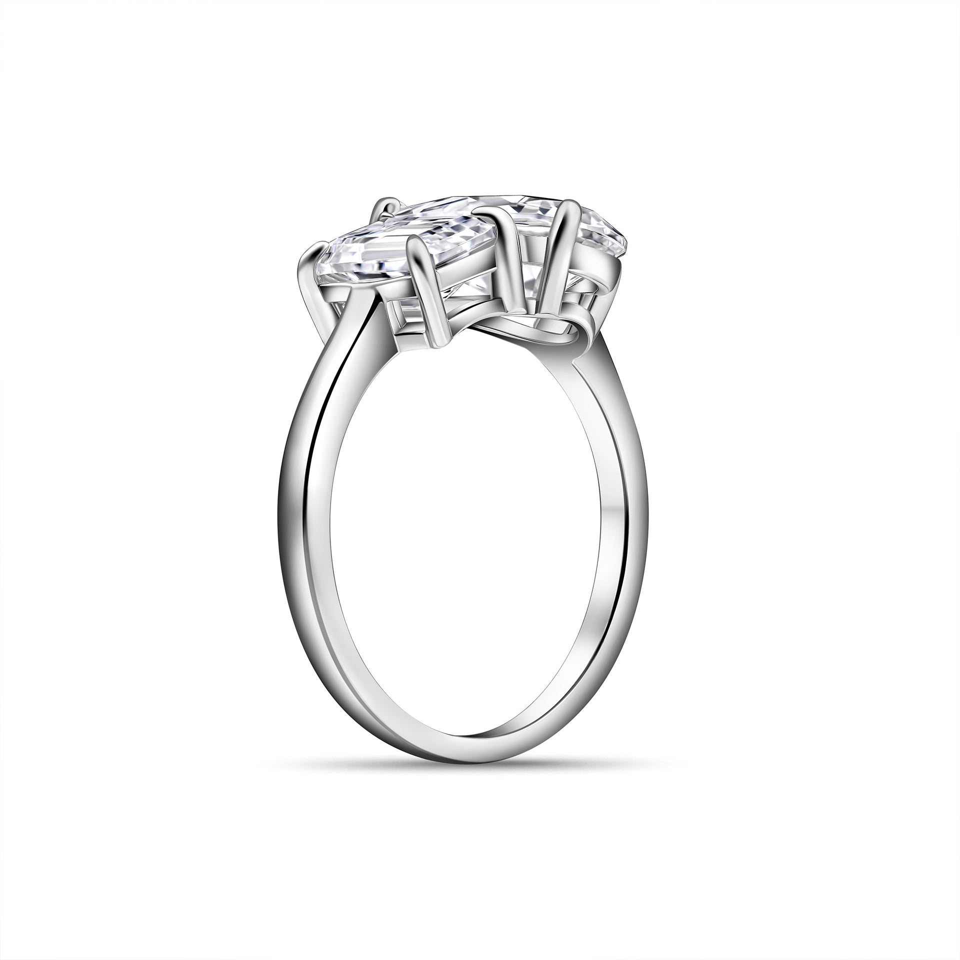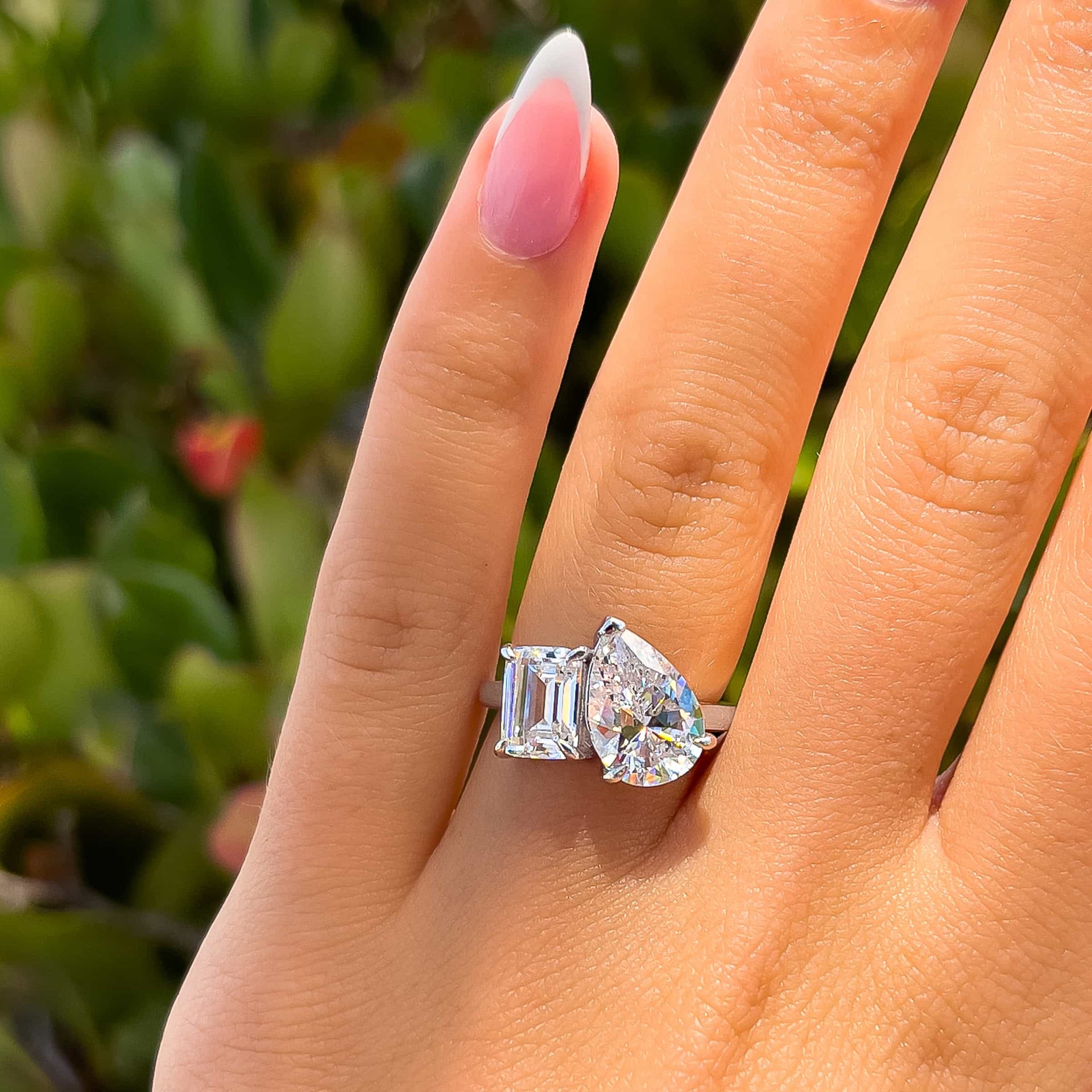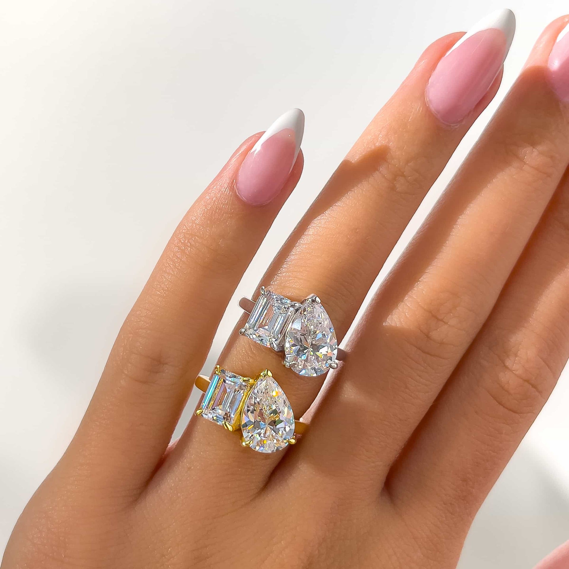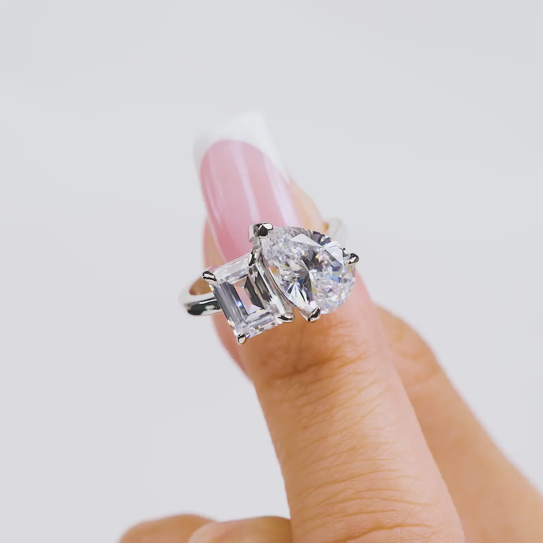 This silver ring will always steal the show. This ring is our first “toi et moi” engagement ring and believe us when we say: this style looks great on everyone. The translated meaning from French, “you and me”, symbolizes a pair that complements each other beautifully. This classic engagement ring features a two-stone setting, made up of a 1.75 carat emerald cut stone and a 4 carat pear cut stone that together create a sparkle like no other. Completed by a sleek silver band, This ring is truly a modern take on a classic style that you need in your collection. Also available in gold.