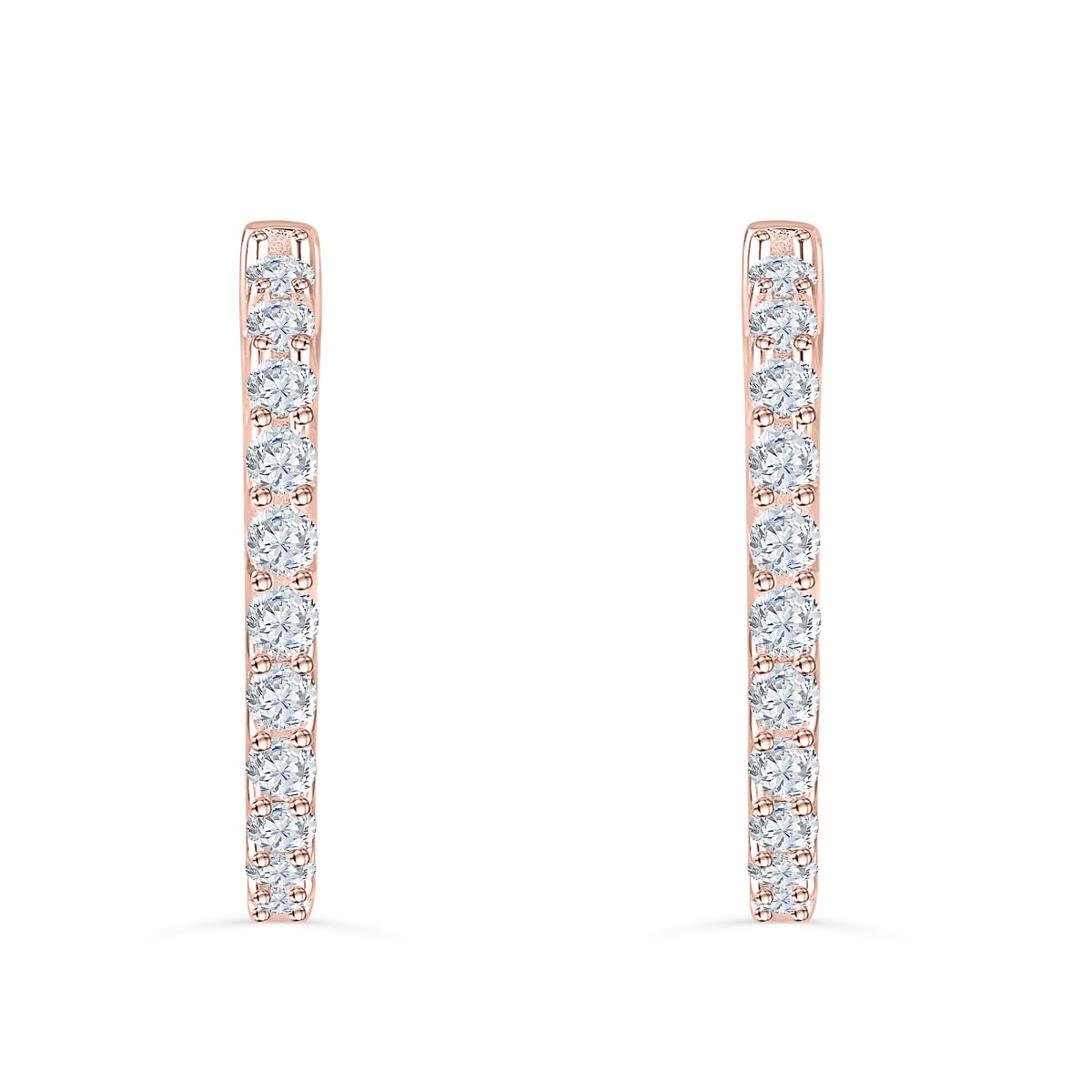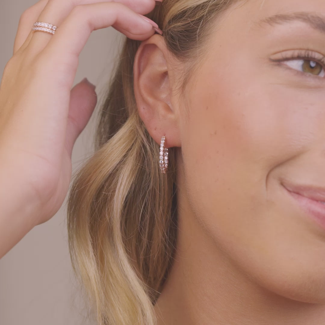 This earring is a gorgeous pair of studded hoop earrings. Featuring a stunning weaved body lined with shimmering and delicately placed stones, this set is made with the highest quality 925 sterling silver, simulated diamonds, and plated in Rose Gold. This pair of earrings will keep its radiance for years to come! This is the perfect accessory for every season — get yours today!