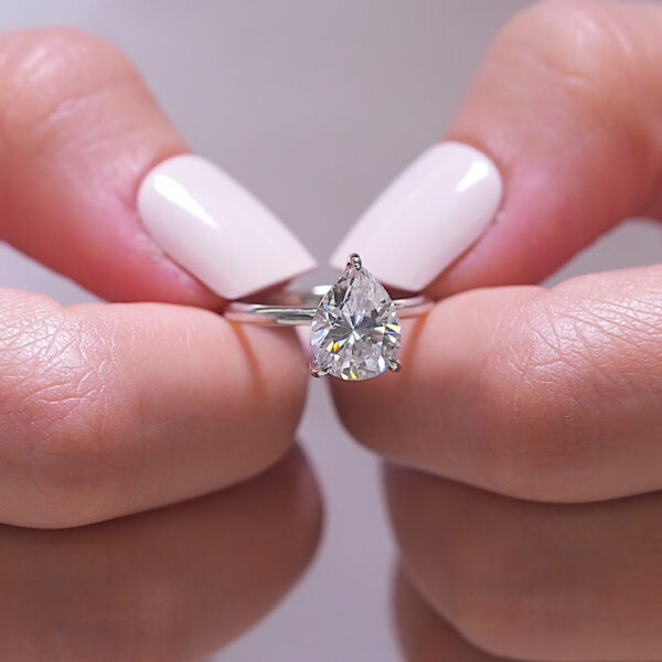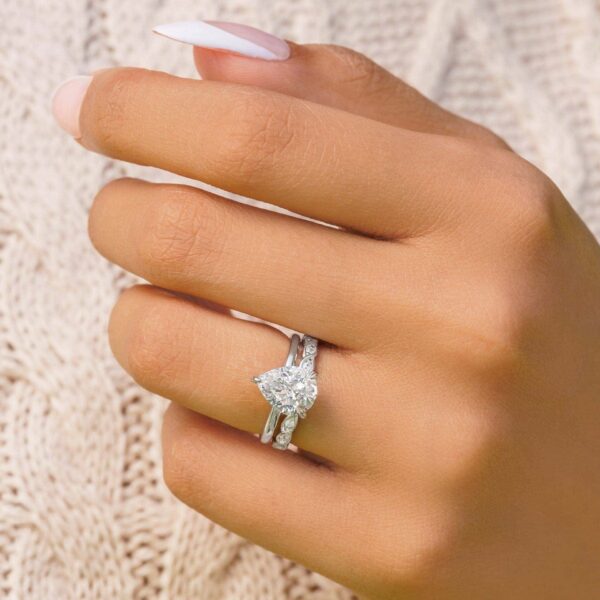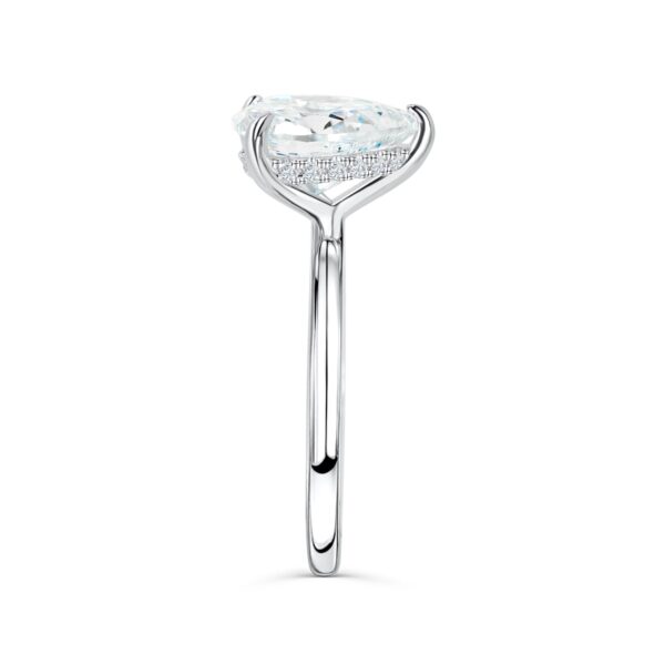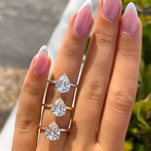 We’re falling head over heels over this romantic pear cut conflict free simulated diamond engagement ring (and so will she)! This ring takes the classic pear shape and adds some flirtiness with a sparkling hidden halo. Because of the 3 shimmering carats, don’t be surprised when people start doing double-takes! Also available in yellow gold and rose gold.