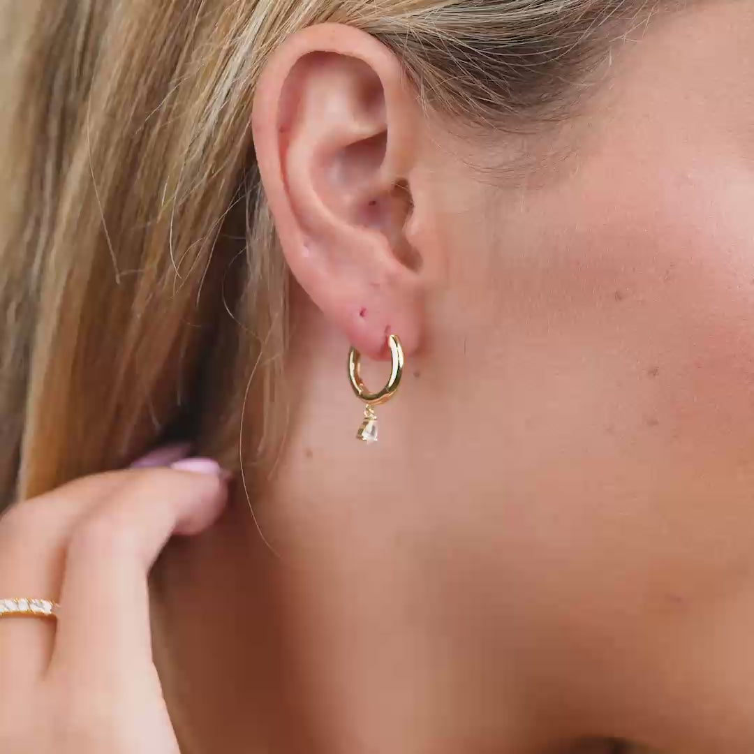 The perfect addition to your earring stack, This is an iconic hoop with a twist! Featuring delicate pear cut drop stones and 18k gold plated hoops, these huggies are sure to stand out from the pack.
