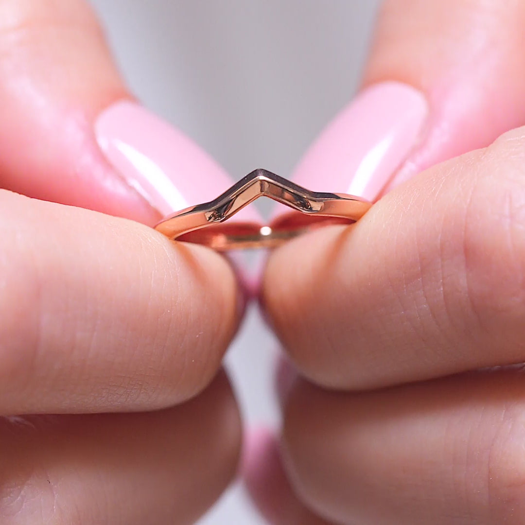 A modern twist on your new everyday band. Perfect to pair with an engagement ring, wear it solo, or stack ‘em with our other bands. Spanning 1.8 mm wide and 4 mm deep at the “V”, The Paige is made of 925 sterling silver and plated with a beautiful rose gold finish.