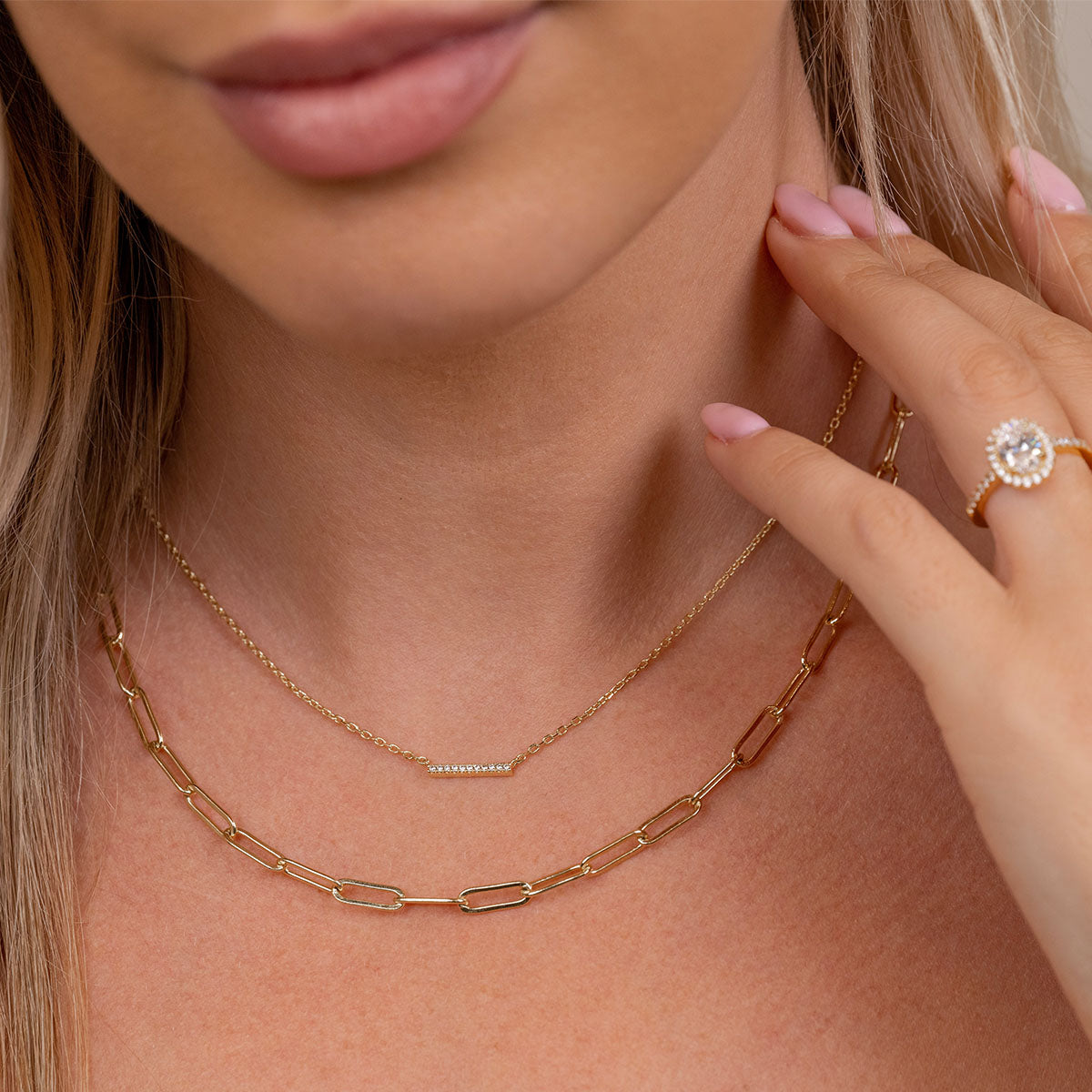 This stunning necklace is what you’ve been looking for! This necklace features a dazzling bar lined with high quality stones on an 18k gold plated chain necklace. Wear it solo or layer it with another necklace for a glamorous look!