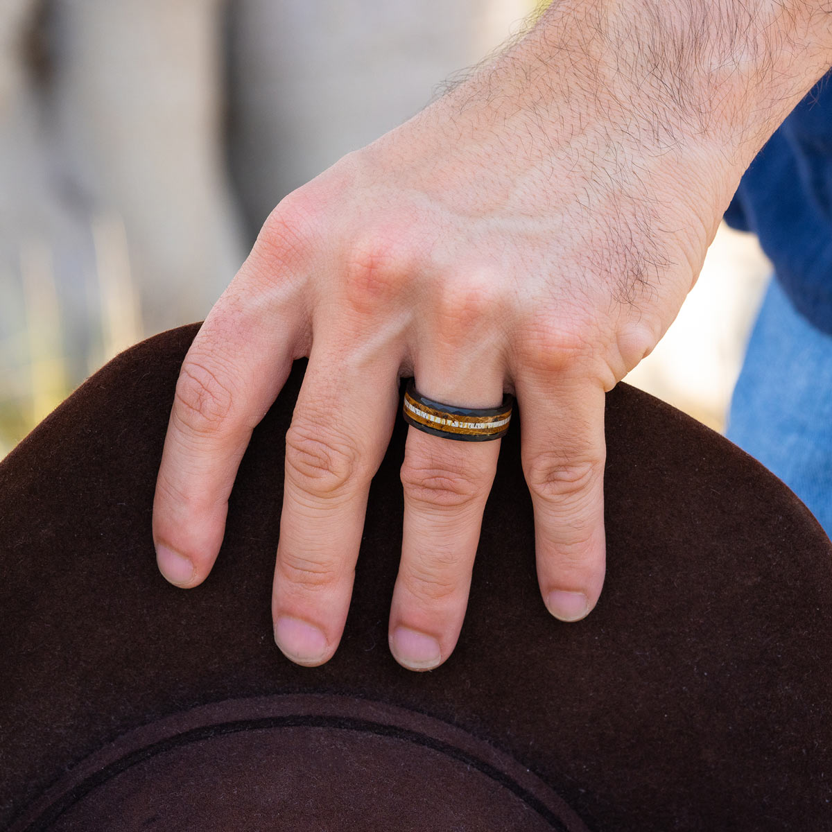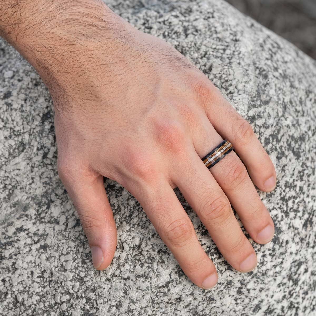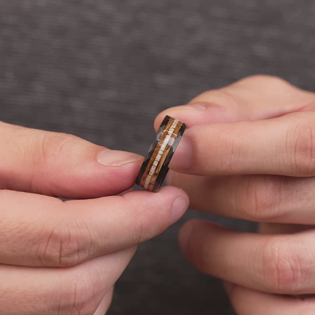 Get ready to rock this ring while you’re out hunting or at the shooting range. This ring shows off a fresh look with an antler inlay and hammered black exterior. This ring can withstand pressure while you’re chucking an axe or chugging a beer. Ladies, this is the ring your man needs!