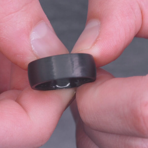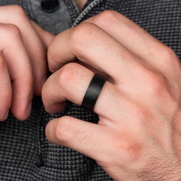 This ring is a sleek, black carbon fiber wedding band symbolizing strength and style. Crafted from 100% pure carbon fiber, this men’s ring is lightweight yet incredibly durable, perfect for any occasion or adventure. The matte black and scratch-resistant exterior surface ensures longevity, while the polished interior offers a comfortable fit for everyday wear. Ideal for those who are married, engaged, or seeking a high-quality addition to their ring collection.