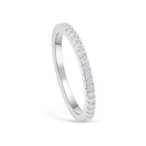 Meet this ring, our new half eternity chevron wedding band. At 2mm wide and 6mm wide at the deepest part of the “V”, this ring is dainty, but packs a serious shine. This sparkling 925 sterling silver band is plated in rhodium and would be the perfect addition to other rings (but you can pair it with whatever you want ).